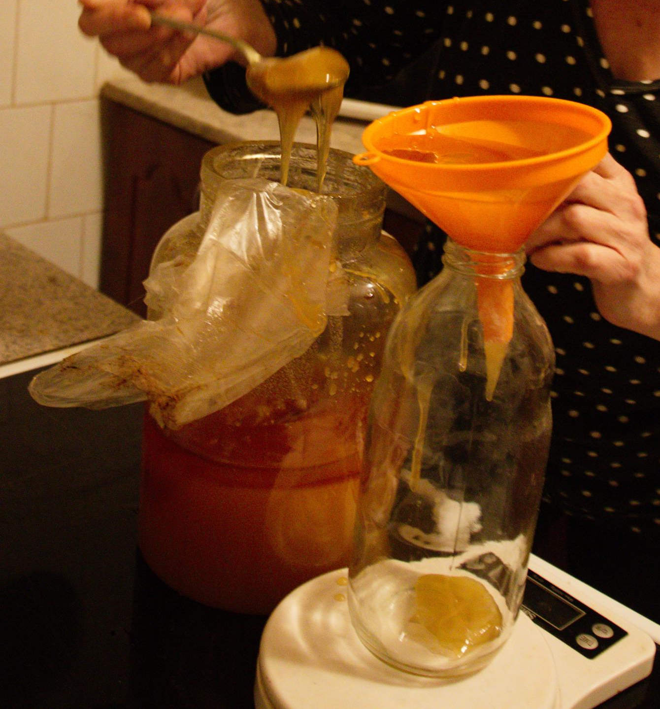 The black currants that we planted five years ago have mostly dried, and the remaining two bore lots of fruit. But they're puny, I managed to pick just one glass, and then nobody would eat that, so eventually she decided to make a liquor of it. She poured a liter of tutifruti, put the currants in and then started adding honey. Which does ooze, but so slowly... She tried to push it through the funnel with a chopstick, which eventually worked, after half an hour.