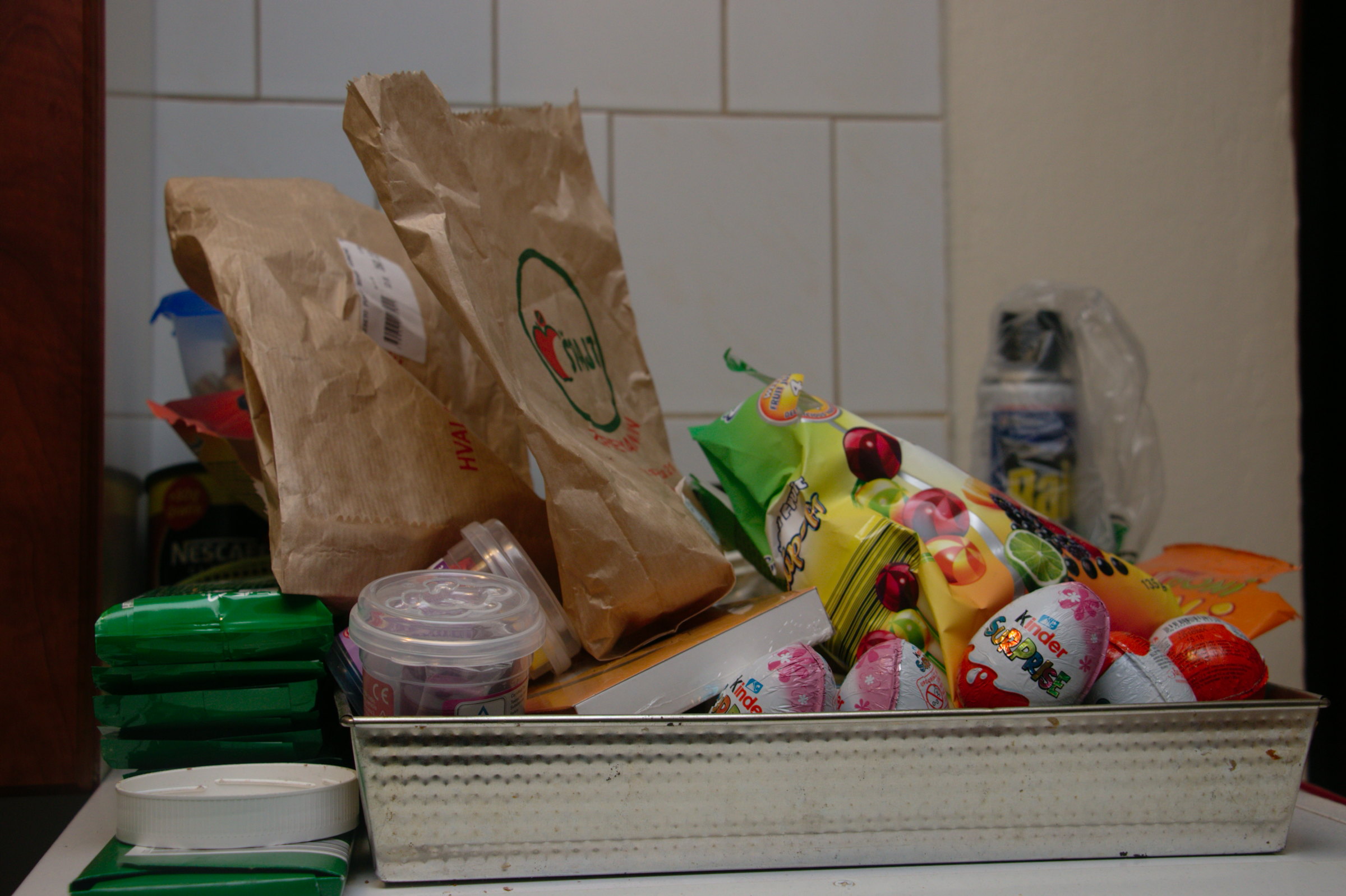 On the fridge, the heap grows. Presently: four or more bars of large (400g? 500g?) milk chocolate with whole hazelnuts (which used to be our favourite for years in SFRY then vanished with the rest of it), four Kinder eggs, two cups of playdo, a pack of ratluk, two bags of lolipops (I'd say 12 or 20 each), two bags from BioŠpajz/BioSpajiz/Spajz/Špajz (see špajiz), few more items invisible on the bottom of the plek, a can of Raid in the back. On the freezer box, the basket (one that's supposed to be inside) holds a roll of aluminium foil, cling wrap foil, plazma keks, carton of eggs (10-pack, not dozen, this is the metric Europe!). The tray in the middle (... 4 words...) holds three bags of different breads of various age. Could be some may be moldy already. We just don't eat enough bread nowadays, to justify the effort in baking our own, so she stopped. I love bread and fondly remember it. On the right there's a packaging box of about 7l, with mostly coconut-flour sweets, cream bananas and few smaller items on the bottom. On freezer's right side there's one of those italian movable shelves from the nineties or even eighties, with bags of nacho tortilla chips, čipsi ("rebrasti salt" aka "ribbed slani" being the only good one, previously the classic was the only edible one), popcorn. Most of it from Lidl.