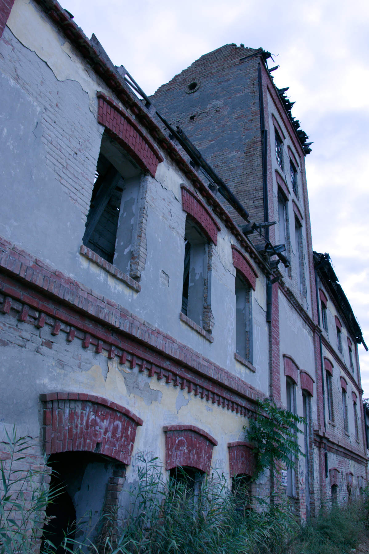 The building was perfect, no maintenance since its construction, some time by the beginning of the XX century. So plaster has fallen in places, the roof was leaking, the beams suffered from the chemistry inside. They rather stopped working somewhere after 1990. There were rumours that someone was killed or just died (suicide?) inside. It was a good hideout, hard to keep closed (doors to the street they shared with the front building, this is in the backyard, so only their own doors could be locked), there were holes in the walls and generally the alcoholics' club was rumoured to have a sanctuary, if not headquarters there. The location is near perfect, accessible from the river, a spitting distance from downtown.