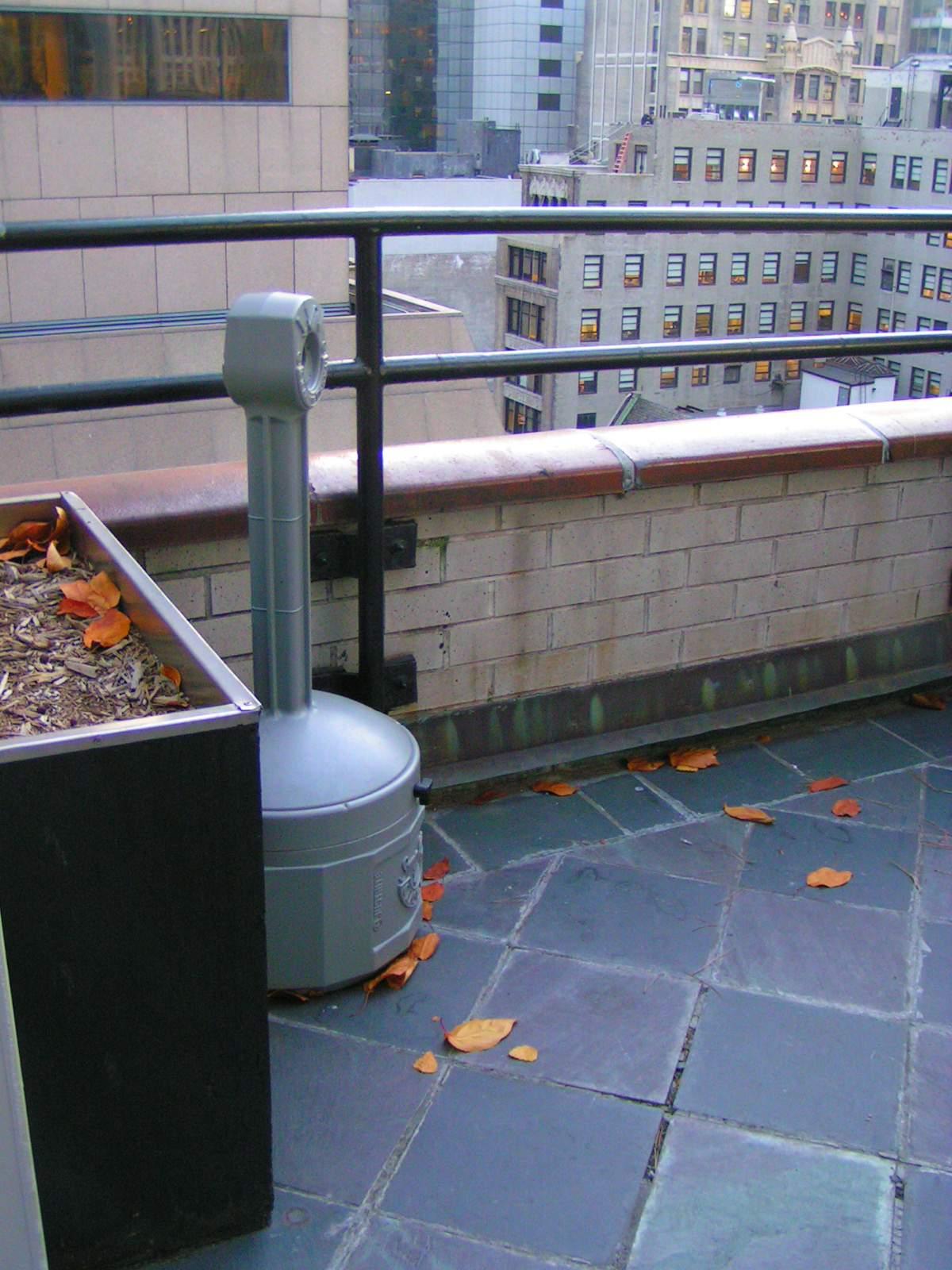 I took my smoke breaks a bit more frequently. This gray little barrel with a periscope is a cinderella [pepeljuga, i.e. pepeljara - ashtray]... there's a vessel with coarse sand on the bottom, which they sift from time to time, to extract the cigarette buts, inserted through the hole on top. Paula scratched a couple of cigarettes from me, give what you give even if it's those roll-owns of yours. She lives across in Noo Joizy, forgot to buy a pack on her way, it's 3,75$ a pack, here it's seven, much even for her... Whoa, how did leaves reach the fifteenth floor terrace? There are no trees at that height. Must have been some nasty wind, and then in these street cannyons I wouldn't be surprised if it blew them all the way up the Building of the Imperial Country (aka empire state billding).