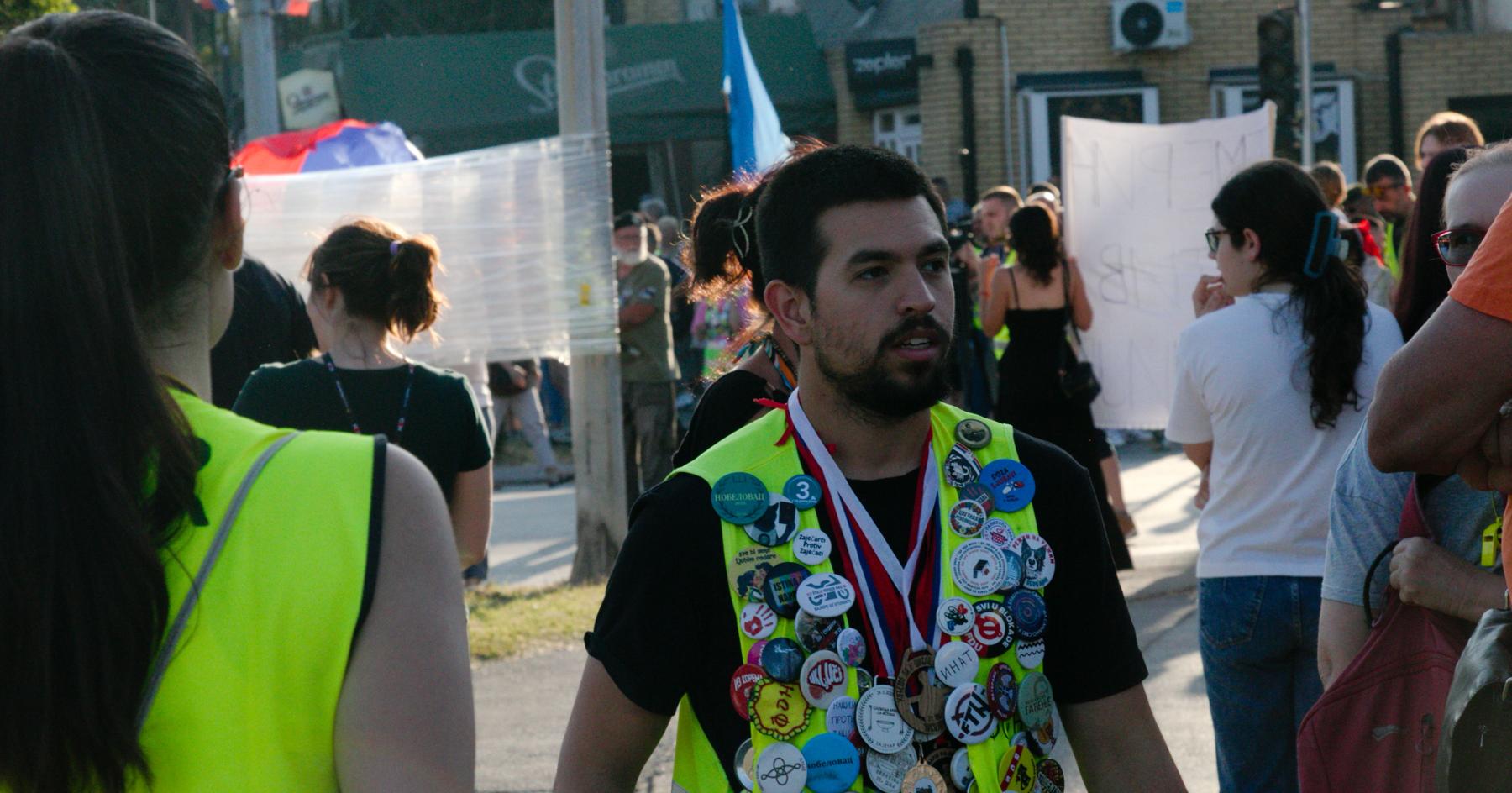Hundred badges on an orderlie's vest, „you've run out of tune - FMU“ (faculty of musical arts), „BIA and I“, „there's no mother born ćaci“ (originally it was 'no hero', from traditional epic poetry, in decameter of course), „we don't break“ (does not mean „we can't be broken“, this is strictly „we're not smashing things“), „From Banat from inat“ (inat is a thing in our mentality, it's the stubborn spite which endures even when counterproductive), „diaspora pumps“, „you radiate badly“, „nobody's tired“ (the running slogan of all the walks from city to city, of bicycle marathon), „Mile, got a heart or aint got“ (Mile is the name roughly equivalent to Joe Q Sixpack), „Salzburg with the students“, „Novi against this now“ (sad means plant[ation], but also means now, so „Novi slobodan university Sad“ means „free university of Novi“ but also „new free university now“, intentionally ambiguous), „from Šumadija mine [folks]“ (paraphrase of „from Chicago mine, you know well which ones“ - the četniks), „we're pumping to Brussels“ (in memory of the bicycling marathon), „Stojan, are you pumping“, „Beware the wedge of Šabac!“ (legendary prank from XIX century, when the cart wheels fell off, the wedges affixing the hubs to axles being loosened), „we are on the road, we're making the road - Topola with the students“ (lyrics from EKV's song), „March to Drina“ (the famous movie from 1966 or so, but also „marš“ as a „get lost“ command), „You shall not dig“ with face of Zoran Radmilović as Laki (from „Marathon family“ movie, though digging here is related to Rio Tinto and lithium, while in the movie it's about secretly recycling coffins), „I Bataja ima jaja“ (Batajnica also has eggs/balls), „only student saves Serb“ (the four C's, actually cyrillic S's, on the state coat of arms, supposedly means „only accord“; originally it was a Β, from greek „vasileus vasileion...“ - ruler of rulers rules the rulers), „ko bre da bre“ (bre is a common interjection, abbr. from brate - you brother - but it's not just „who bro yes bro“, it's also „cobras beavers“, because after „throw us some cobras to play with“ the students formed their own unit, the beavers, named from these very words; this time it was on a Heineken logo).
