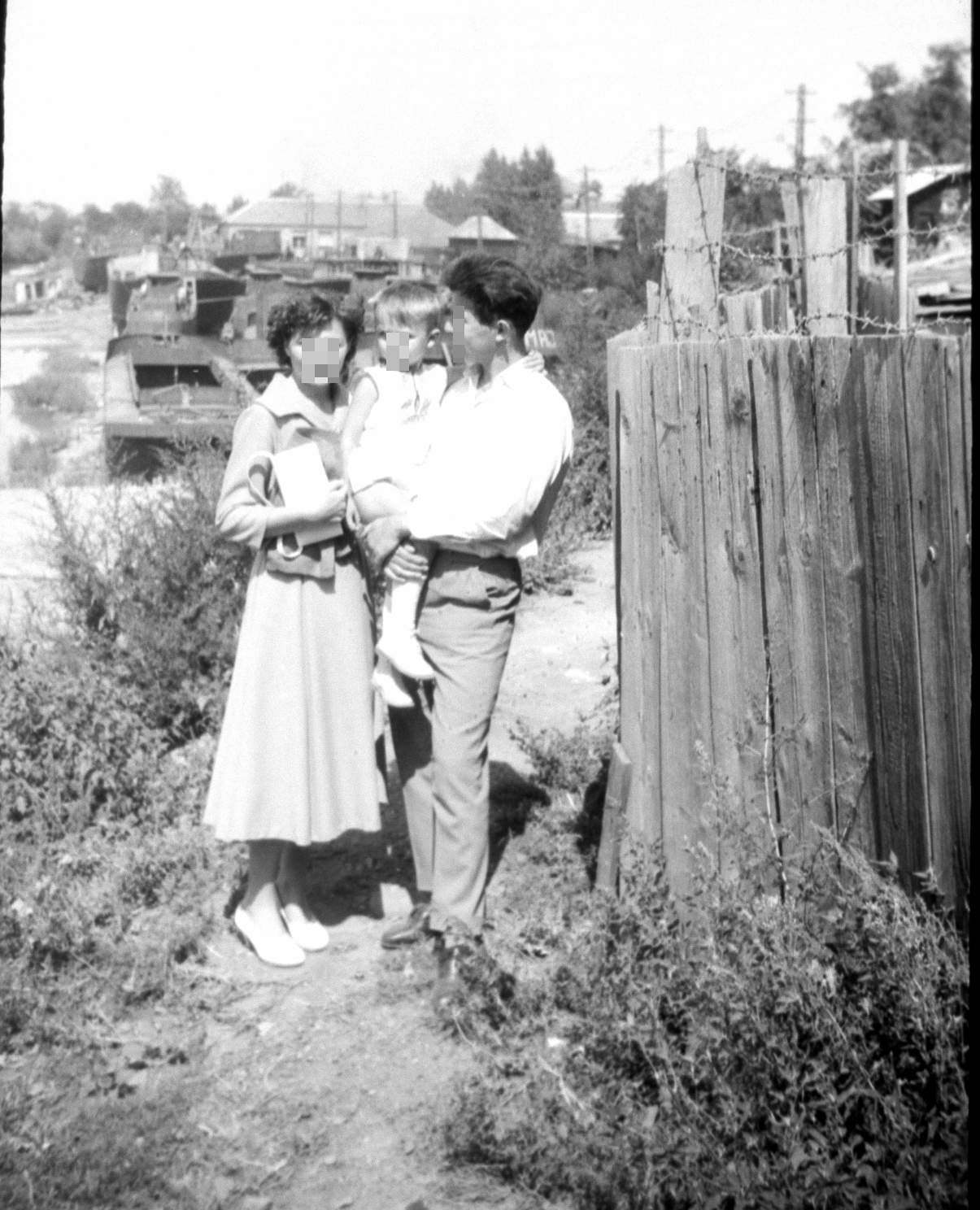 На овом негативу су три серије снимака. Кева и нека риба (добра, кад погледам данас) на плажи наспрам Лебарпрома, на реци. Ту плажу никад видео нисам, док сам доспео до тог краја, нестала је. Ту је изгледа била нека кућерина са поприлично широким степеништем, па се ту седело и сунчало. Ту на једној фотци, мора да је сликала кева, седимо она, ћале и ја на тим степеницама. Ћале носи сандале преко чарапа, што је тада био општи обичај, и прилично је мршав.