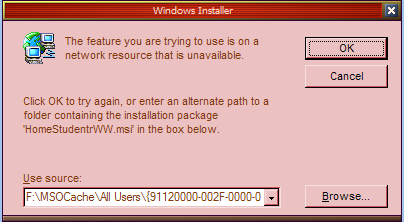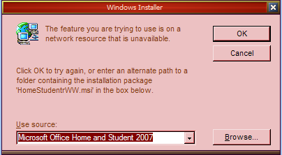 Инсталисао је шта је већ хтео, па да пробам поново. Лансирање Ексела двокликом на цсв фајл одмах изазива да setup.exe (који? на диску их имам на десетине) покуша да зове 84.53.144.9:80. Кад му то не дам, то покуша msiexec.exe, одбијем и њега. За то време, Пенџеријски инсталатер (пардон, Инсталатер) каже исто што и на трећој слици, јер је опет заборавио где ми је инсталациони диск. Друго место које нуди је опет f:\MSOCache... исти стари непостојећи директориј; блажено поњатија нема да је у међувремену направио нов. ОК, водим га на деведе јединицу. Кад кликнем на Browse оде право где треба на деведеу - значи знао је где треба да гледа, осим што није (!).