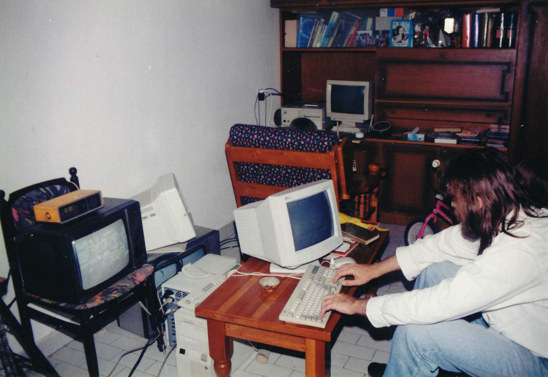 На овој фотци ми ама ништа није јасно, шта је то било и кад и зашто. Ајде што имам два рачунара на сточићу и чак и нешто радим на једном од њих, могуће је да сам их напросто паковао за неку муштерију, инсталисао шта треба. Мој рачунар је оно у регалу, видим да већ имамо звучнике око њега, неке што дођу у кола у ствари, ал' раде и овако убодени директно у звучну картицу (да није Бранко опет морао нешто да ми леми?). Већ има пешес цедеова наслаганих са стране. За њим је, вероватно, Нина - Лена се не би видела из фотеље. Њен трицикл је паркиран ту поред.
