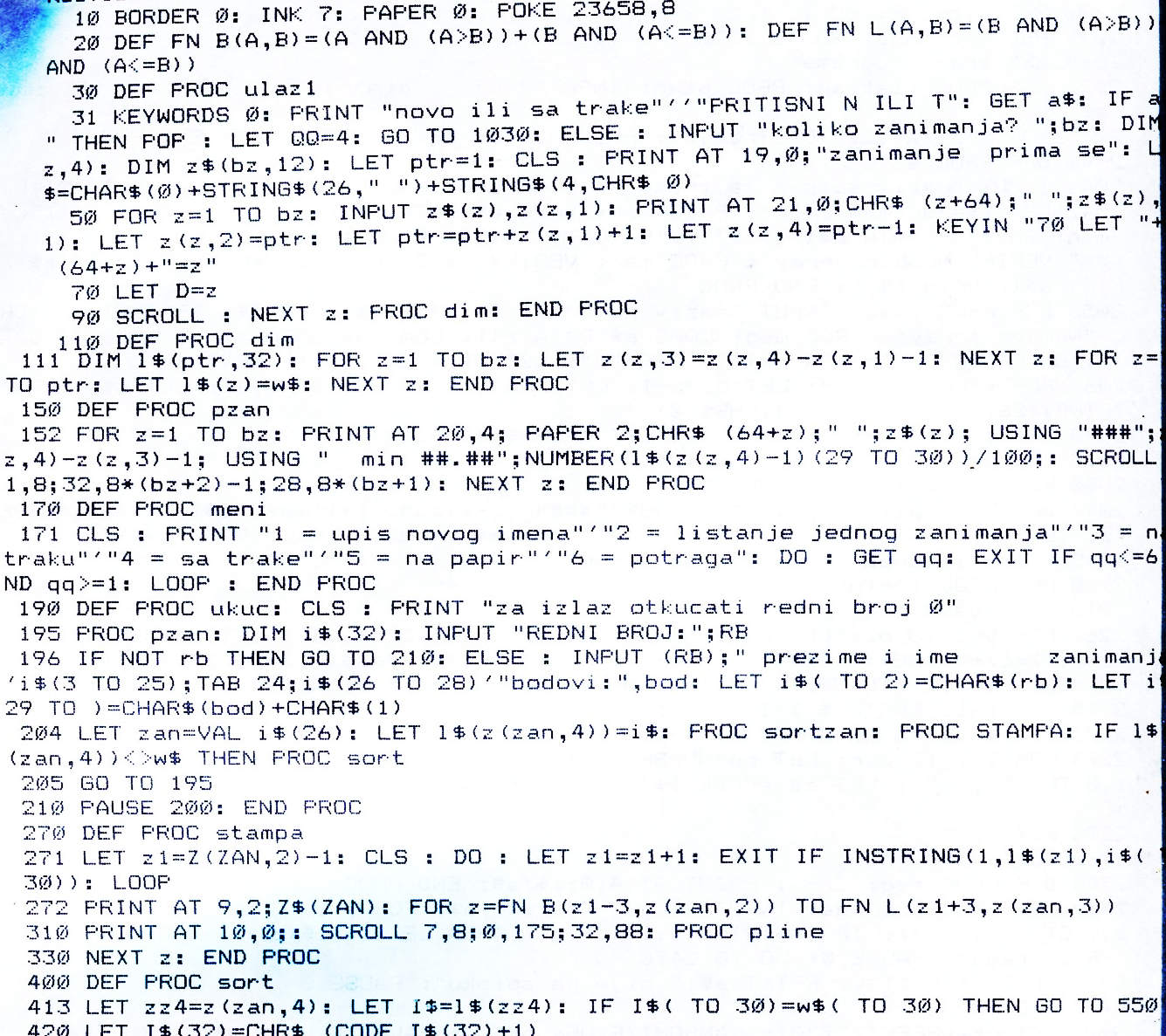 Био сам негде набавио Бета Бејзик за спектрума, у њему сам радио и те бодове, а овог пута сам урадио и упис, и то мало комфорније него претходних година, стање је могло да се сними, а било је и графички сређено штогод. Средио сам и штампу, носећи кући штампач и интерфејс, с тим што је оригинал драјвер био предвиђен за спектрумов термички штампач, а ово је ваљда радило на тај серијски, РС-232Ц, пише то у септембар 1985.. Листинг тог драјвера сам нашао, ал' ми је занимљивије ово на шта је личио програм за упис... сад једва пола разумем шта сам ту радио :). Наредног месеца, кад је био упис, тим програмом смо (ђаци из секције и ја) укуцали сва имена, бодове и одабрана занимања у тај програм, и пола сата по завршетку пријема папира окачили одштампан списак примљених по занимањима. Који нико није видео до сутрадан, јер није ни било најављено (није ни могло бити, нисмо имали појма колико ће да нам траје то), папири су се увек сређивали сутрадан, и за тих пола сата је све било спаковано и сви су се разишли, осим теткица и нас.