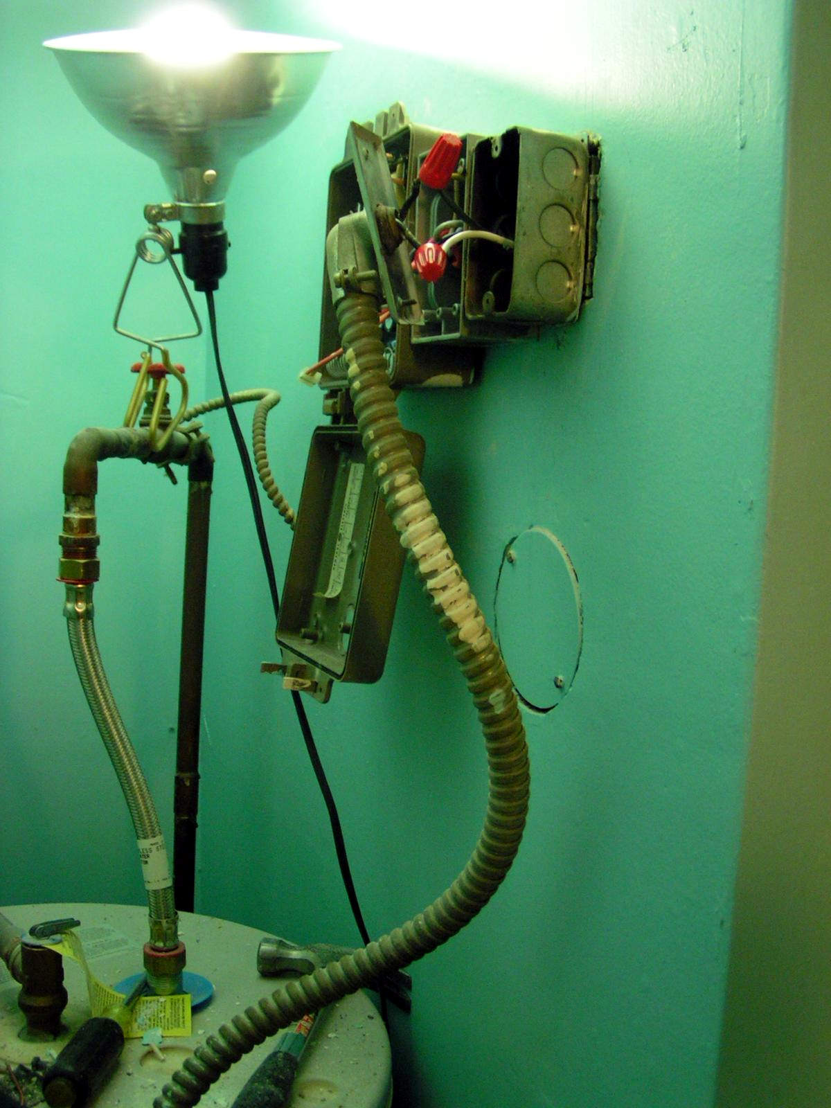 Пронашли смо да бојлер има и некакав упуштач, некакву електронику кроз коју добија струју, то ће бити она већа кутија на зиду, али да је то одавно искључено и струја иде право на грејаче. Тј искључено је кад је први пут прегорео контакт бакар-алуминијум.