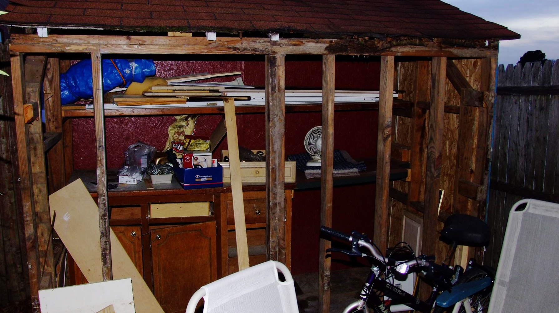 Ми смо кренули да сређујемо стражњу авлију. Није нешто велика, шест са шест, ал' зато у њој има та шупа која заузима пола тарабе према Јулишки. Шупа је већ била напола трула, а на спољној страни се већ запатило доста алги (алага!), влажна је клима а она гледа на север, буџаци јој се никад не просуше. Отишли смо до Луа и купили два пластична ормана за напоље, склопили их и паркирали уз наспрамну ограду, где сам јесенас довршио поплочавање, и данас их монтирали и пребацили из те шупице све што је вредело сачувати. Остало смо напросто бацили. Све даске које је смо могли да употребимо смо очистили од ексера и вијака, које сам можда прва два сата покушавао да скупим, па дигао руке, пуштао сам их да падну. Учинак за данас, скинули смо предњи зид.