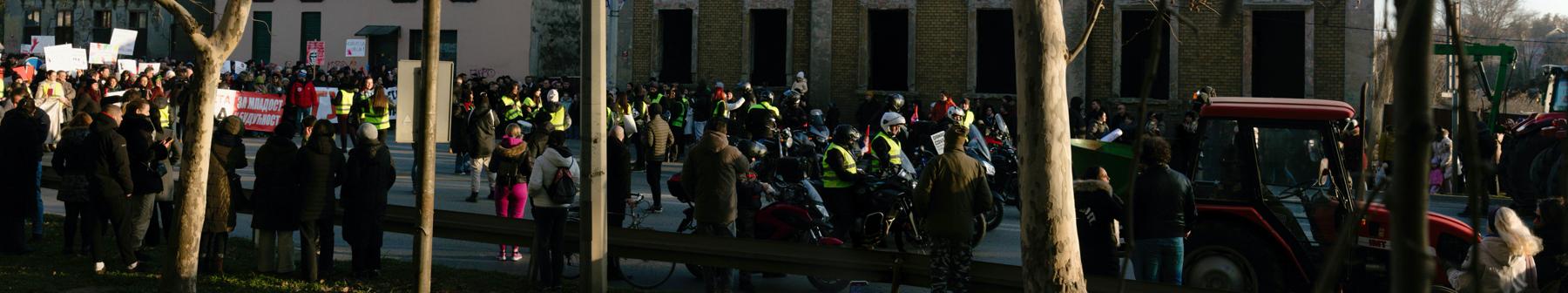 Ту смо опет чекали да се колона покрене, ал' јебига, координација између педесетак редара, чете тракториста, туцета бајкера и одбора за дочек с друге стране надвожњака је вала потрајала. Опет смо шмугнули здесна и попели се на надвожњак степеништем. То степениште је било кратко у употреби, док је пруга била доста прометна и сваки час се спуштала рампа - надвожњак управо премошћава то место где има четири колосека између главне и теретне станице. Онда је железнички саобраћај замро, испод надвожњака се успоставила пешачка стаза, и више се нико није пењао с ове да се спусти с оне стране. Ал' згодно дође за ову прилику, само треба пазити на испале и распале степенике. Ухватили смо таман полазак, поред нас су прошли и ти трактори и бајкери. Кад је шеталица (чело колоне, три транспарента које носи предњи ред, целом ширином пута) била надомак нас, закључили смо да смо се већ смрзли, а мени је бешика најавила узбуну за мање од пола сата, дакле тутањ.
