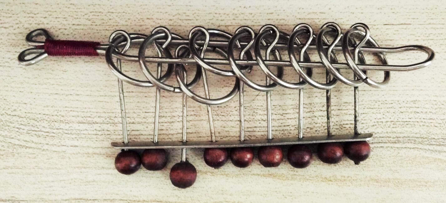 Креће се од положаја где је тај уздужни комад провучен кроз све прстенове. Завршава се тако да је опет провучен кроз све њих, али тако да је и она жичица такође провучена, тј да су прстенови оборени.