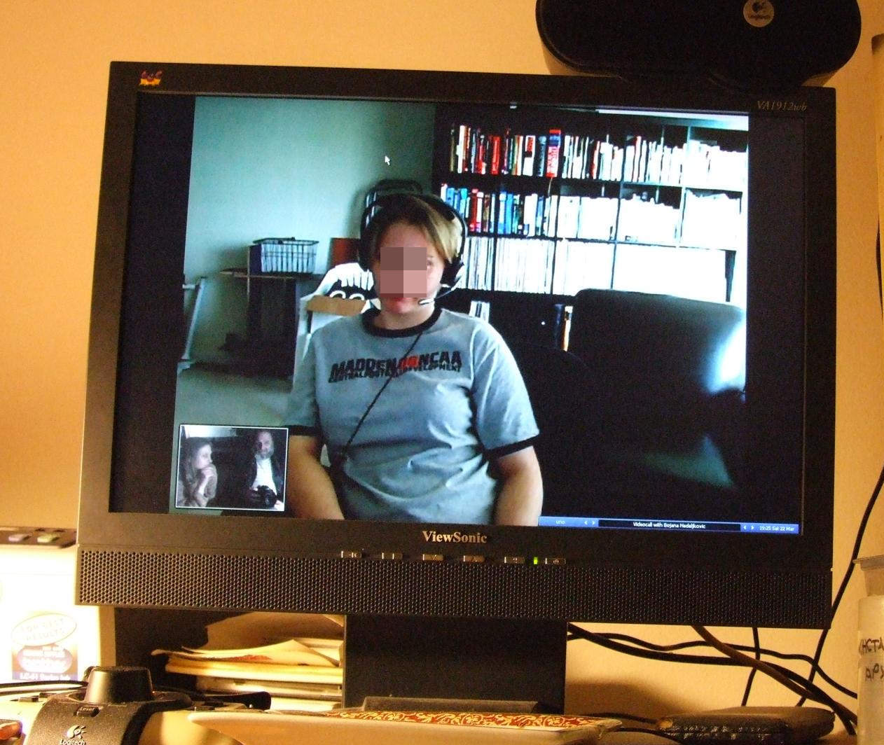 Двајздруги, причамо са Гораном. Ни овог пута је нисмо питали шта је тај мачак Феликс на столици иза ње. Те пластичне столице смо купили она и ја још у Орланду, да имају за терасу, и ето стигле су у Сијетл. Ал' та два мачја ока ми нису дала мира. И коликогод да сам нахватао ситопуца (screenshot), ни на једном се то не види, а стајало је тако бар два месеца, него тек на овом, где сам фоткао мониторе Фујицом.