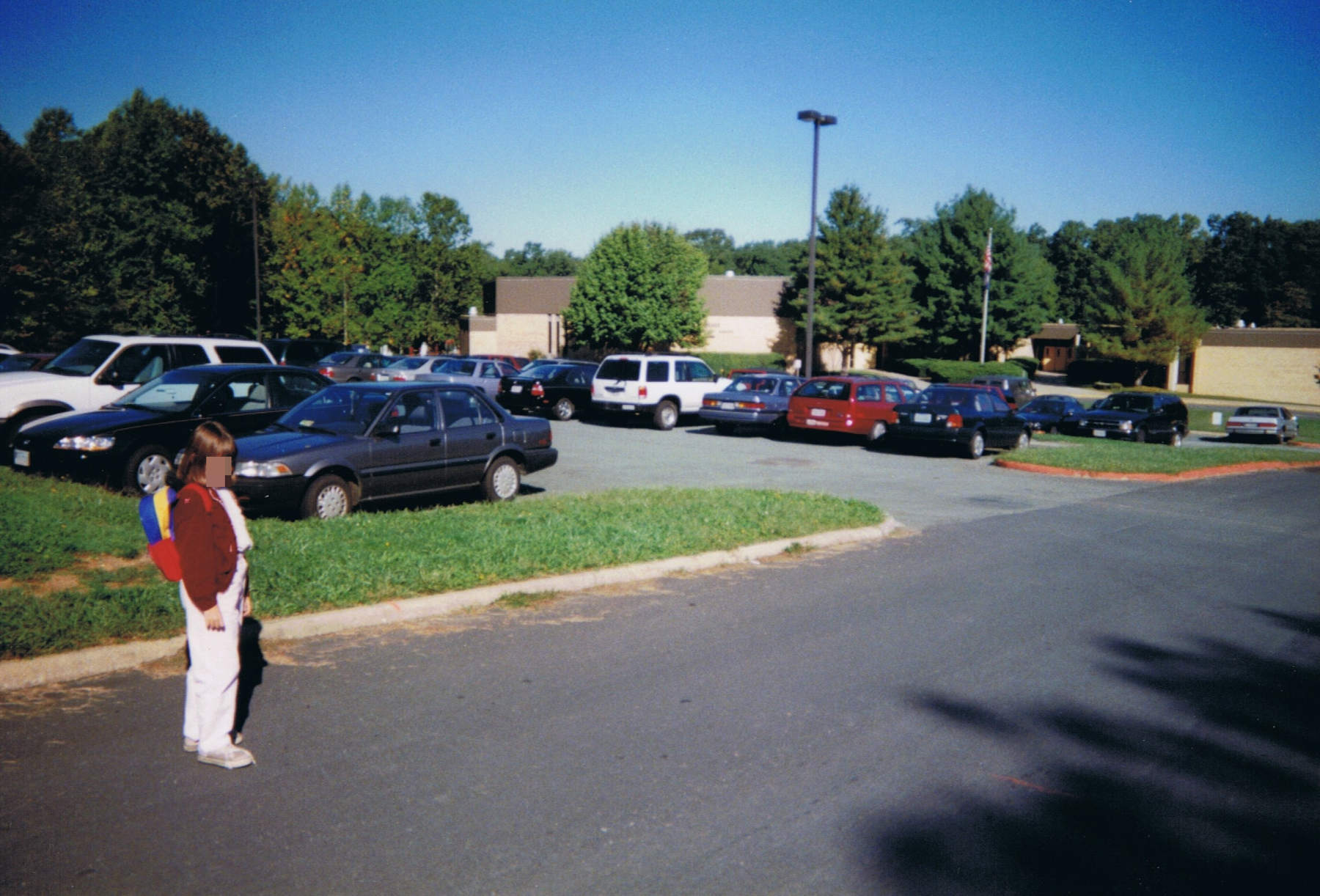 The picture was taken by some disposable camera I got - the darker corners make that obvious. It being not digital, we had only prints - don't even remember whether we got the negative. Only four prints survived. This is Lena in front of her school, first day. About one third of the school grounds is the parking. I love it how they have forest everywhere in these parts.