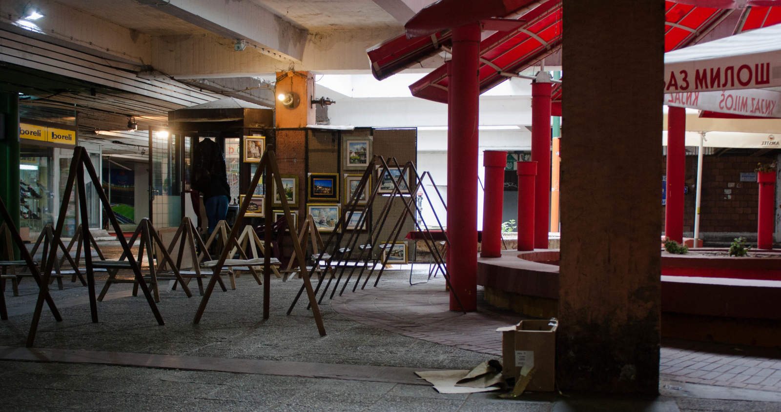 The place is... fuckit, maybe I'd be able to find it again. Somewhere near the new Merkurator (as granma called the old Merkator), roughly. By the entrance into the passway (bgd. pasaž) there's only a plate advertising the exchange shop in the yard. There are several stands with clothes, bags, belts and such. May is the month, but it's still cold after the rain (the floody), jackets are worn. The light is so, cloudy and smudgy.
