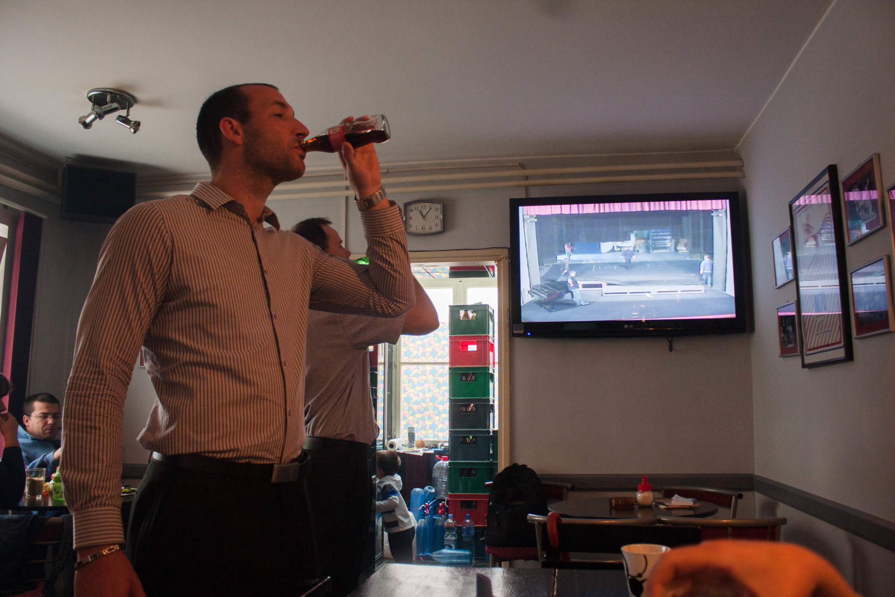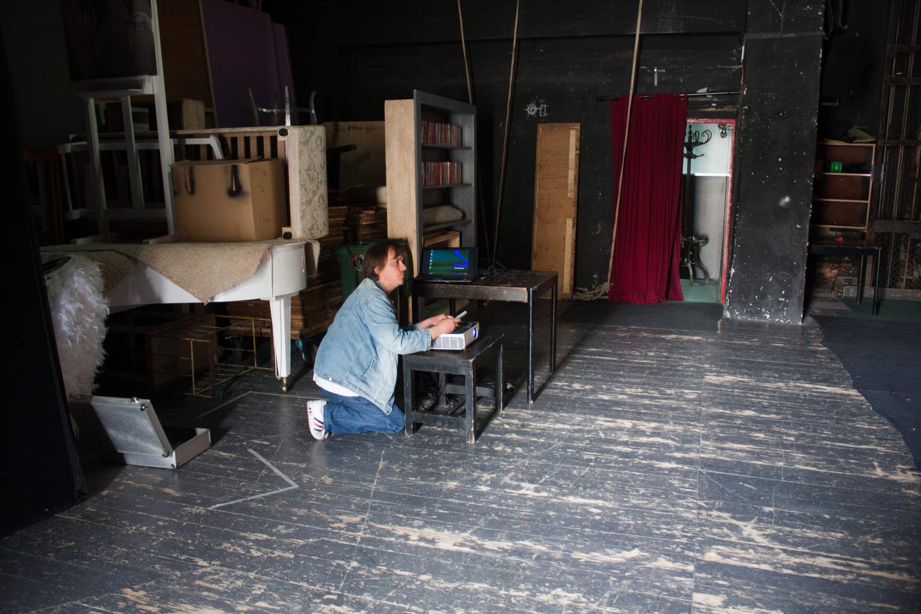 My job was to organize a slide projection. I had collected about four hundred shots from my own archives (all those hours of reshooting old negatives starting to pay off), plus a few dug up by one guy from the 2nd gimnazija, and a few from Žuca; used IrfanView to build a slideshow. Put that on a laptop (Lena's old gugolj) and took that behind the scenes. Ever since that theater festival in 1972 I had no reason to find myself there, but now did and enjoyed it. Took a few nice shots there, with the two actors who actually had a part in our "solemn academy" (as this kind of show is called) patiently posing in the pose I tried to catch - repeating it as needed.