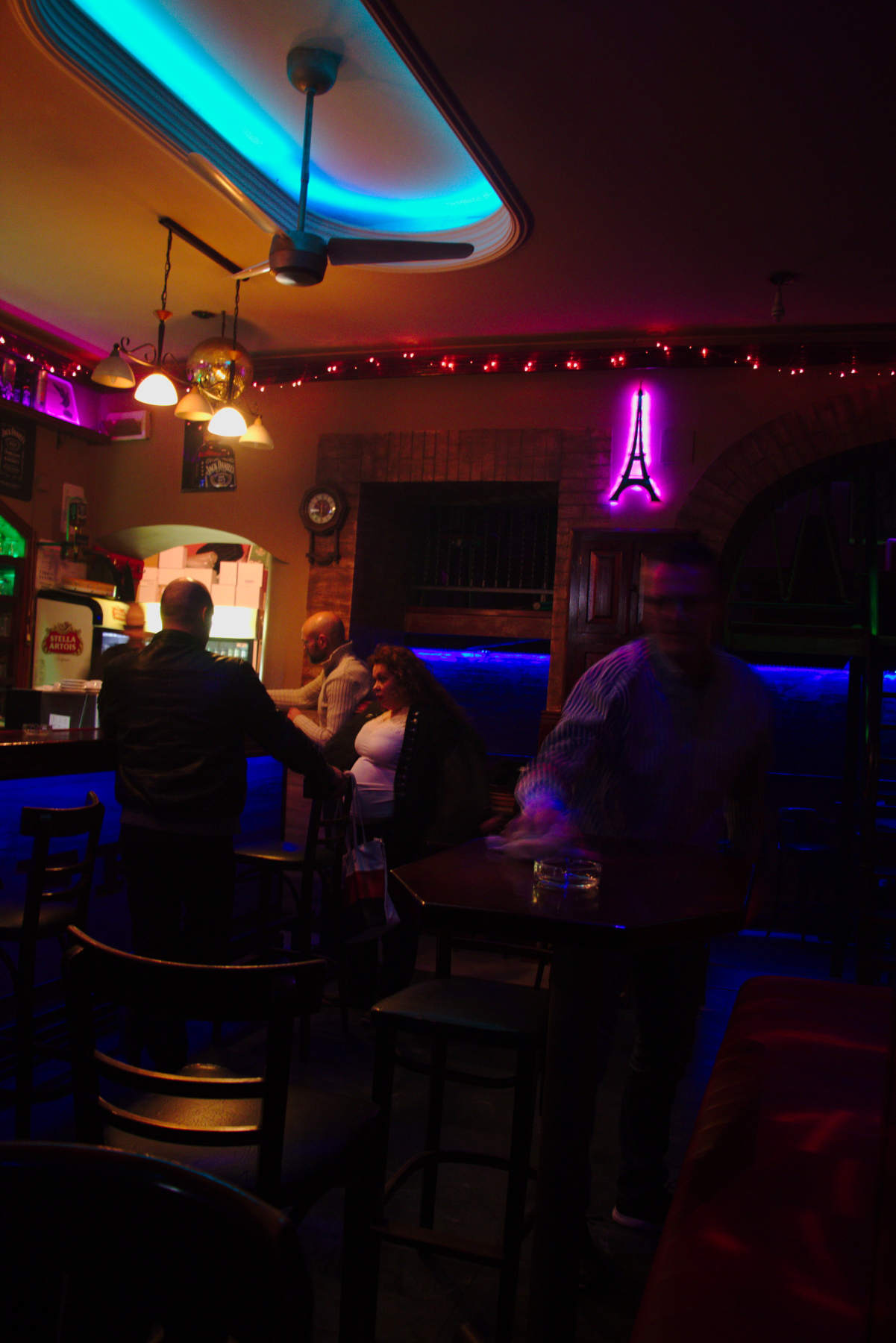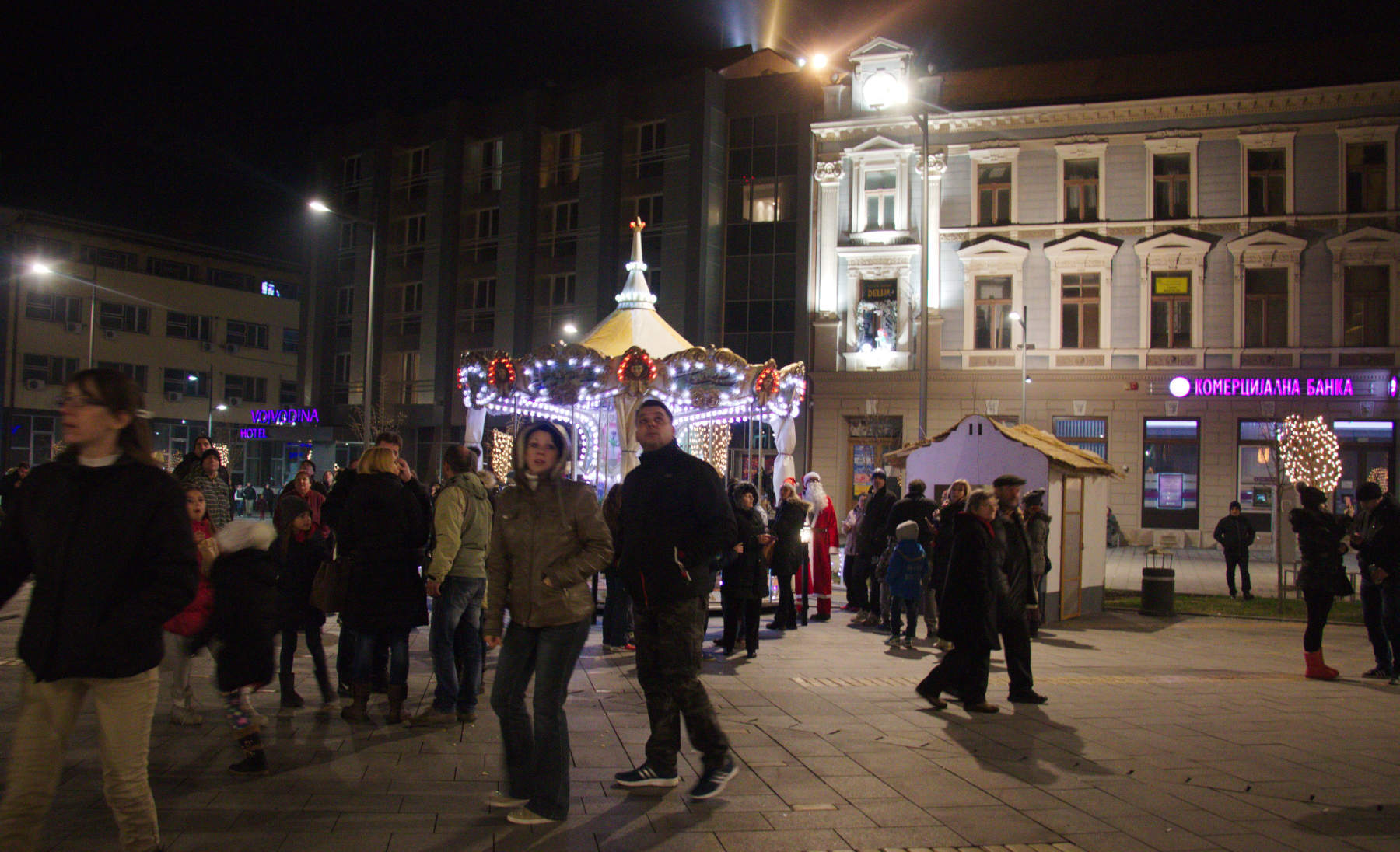Well, we finally go for a doček. Haven't done one since new 2011. The weather being unseasonably warm, we just walked to downtown. I imagined this to be a photo-safari, so I took the eos70 and the new flash and started shooting as soon as we approached the downtown. Were supposed to meet with Arpi, but when I called him he was just getting dressed, and my (šne) nokla gave the signal that the battery is nearly drained. It didn't look like there's much of a crowd when we got there - and the famous (from late 1970s) band "Atomsko sklonište" from Rijeka would begin a concert at 22:00. Assuming they were true old rockers, so the concert couldn't possibly begin on time, we tried to have a beer at "Biblioteka" ("Library"), one of the dozen cafés in gimnazija street, but it was closed. Well, next one, "Trocadero". Funny lights, just a handful of people, good belgian Leffe dark beer... small, though, so we had two. A dozen good shots.