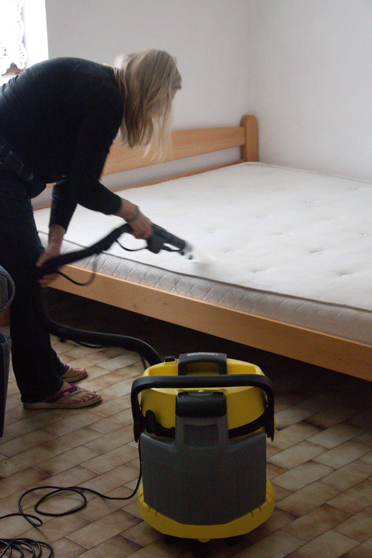 The former tractor, extractor, came today. She plugged it together, I inserted the wheels, and then she redid the mattress in the yellow room. The bad job the guys did the other day has left too much, as if they did nothing. When she finished, it was like new - one'd never guess that four kids have peed on it dozens of times each.