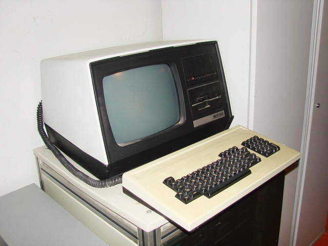 It had a 5.25 floppy with a weird 640K format which I managed to read on a PC only once. Had a 10M disk with 16 folders named "", 1, 2, ..., 15, the one named "" being always visible ("included in the path" was the expression under DOS etc, later). The screen was green but non-glare and actually wasn't bad at all, it's only that the characters were made of tiny green dots, so it was as if on a dot-matrix printer, only green on black. Could be tiresome if set too bright. The keyboard was among the best (with a 6mm banana plug on a coil cable, never seen that again).