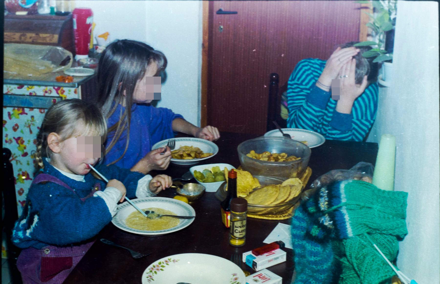 We somehow preferred to, of the whole big living room, sit around this table by the back wall. For lunch, as I see, we had „real soup“, i.e. not something out of a cube but straight from meat, fried potatoes, pohovano ham salami, pickled cucumbers. Now looking at it we remember how that was still the proper good ham salami, with exactly the meat the recipe calls for. The only thing they, like, fumbled with (from what dad heard in the mess hall in the factory), was to replace the gelatine (which they had to buy) with something their engineers came up with, boiled pig heads and selected offal which was previously dumped to kafilerija (qv) and got something even better yet cheaper.