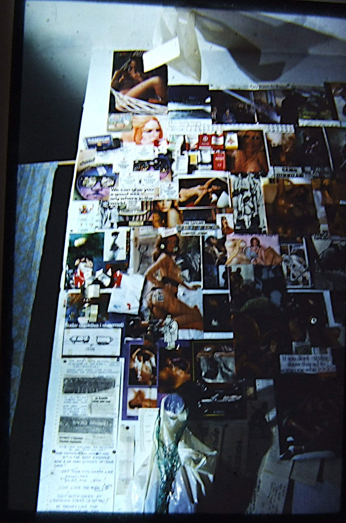 The bag on the ceiling is decoration, what with the punch card with something possibly written on it. The bag and the net tote hanging on the wall below are... well, being short with shelf space, this is where we kept the bread. Too bad I didn't reshoot this better than I did, so I can't quite read all the wisdom we poured on the paper bottom left.