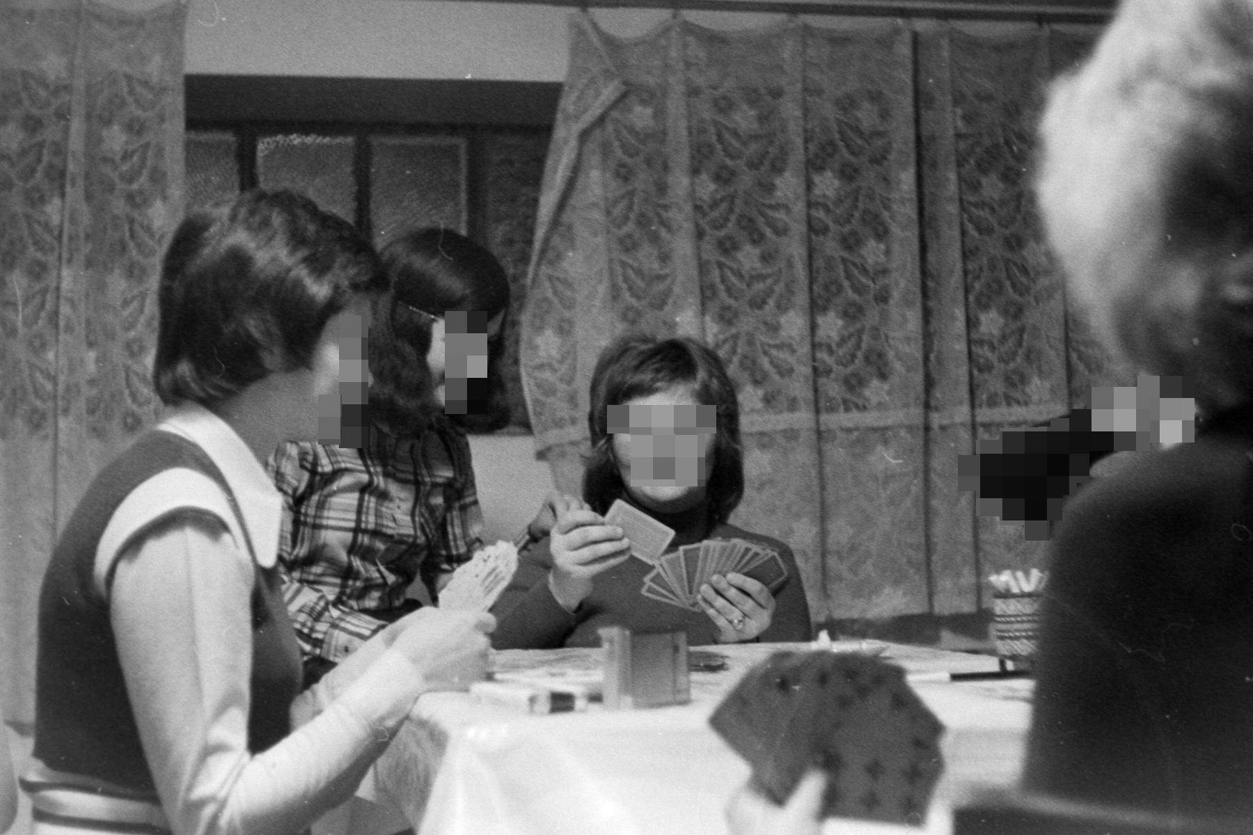 Among the photos of this month there is one evening series, shot in the basement where she was roommates with Đenđi, with three other girls from other rooms. We played cards, this must have been canasta as no other games requires holding fourteen cards in hand, drank Cezar (Caesar) vinjak. There are also the kids from the house, Đenđi is some aunt to them. My dear had knit sweaters for them later (next winter?) and even tried them herself. Must have been this winter, because I remember recording exactly this „and I tried them“ on tape, which means I had brought the tape recorder from DC-99, because I was putting together the sound for „Busodrom“. I made the recording one sunday afternoon, when she'd come to me and we'd sit all afternoon with my folks, before catching a bus or train to Novi.