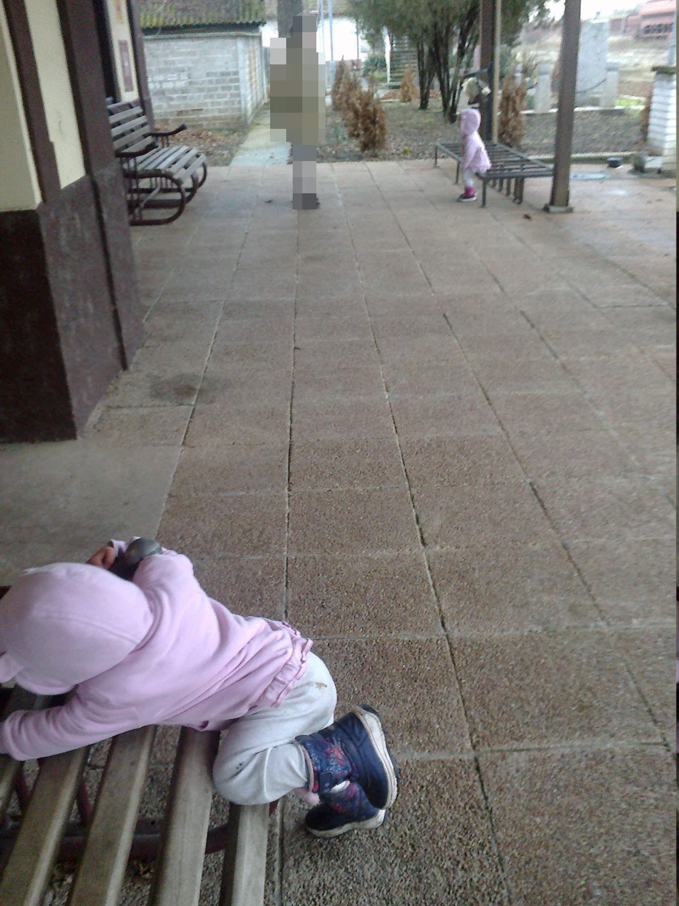 Took the twins, on bicycles, to the Fabrika station. Didn't take the regular eos70, made some shots with my old nokla E5, still good for pics. Burned the sunlit sides of their pink jackets (they call them "hat" because the hood is the most important part of it). The station master and his assistant (both fresh grandparents) didn't come out to admire the twins this time. We walked down the track for a few hundred meters, but not far enough to see the tower which I see every evening from my simpić chair. I did see it a few times - with the new 60x telescope I got from Lidl, or now when Sanda and I went a couple of blocks straight before taking a turn to the station. Looks like an oil rig, just unclear on the color - in dusk it looks white; now it looked dark, probably because of brighter sky behind.