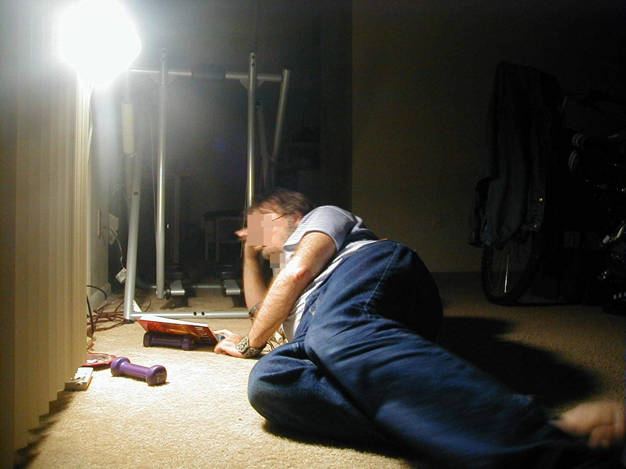 On 14th, this photo of me reading Simmons's „Ilium“. The exercise rack we brought when we moved, and on it I hung one of those twisted neon lights, which we used for the pretend photo studio. The weight is only a two-pounder, not much, and I'll soon have to move to something bigger.