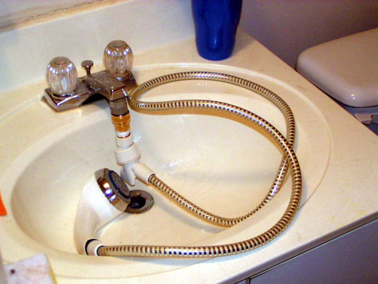 The only place where we have hot water is the lower bathroom, and we're already due a bath, hosing each other in the patio isn't enough. We could use this small bathroom as a shower cabin, if I could only attach the shower hose to the faucet, using the aerator's thread. Hmmmm.... went to Lowe's and explained to some older guy in the plumbing section what I wanted to do. Straight screwing is impossible, not the same thread, nor size. But I got the guy interested in the problem, and he started combining various fittings. On third try we had something, mostly brass, also including a piece of rubber hose in the middle and two braces, which will get the job done.