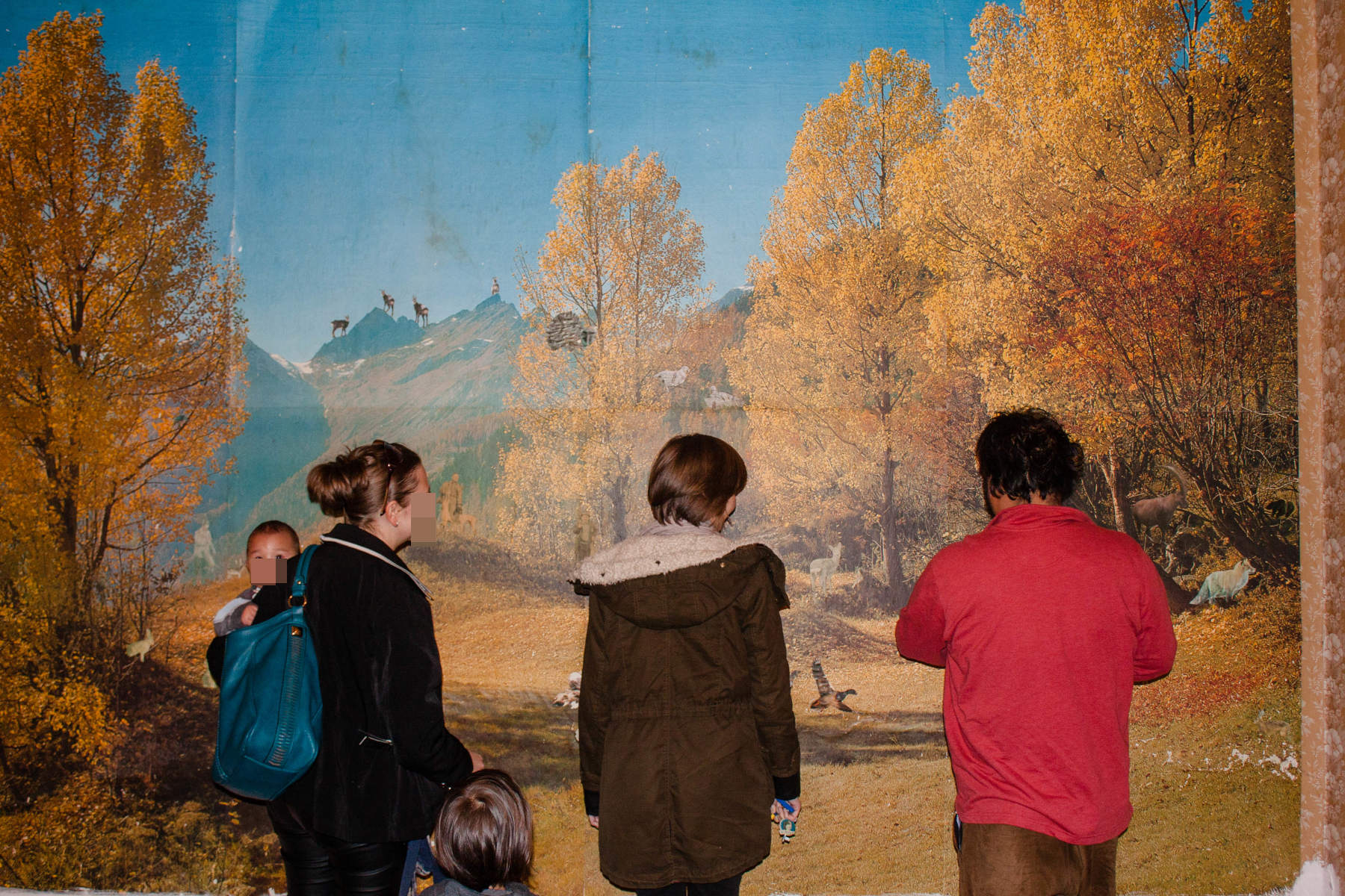 The old man was a passionate hunter. He adorned the branch stumps on the thujas with empty cartridges of double barrel's ammo. Here in the salon he used the blind wall (other walls have windows or doors) to put up the great photo wallpaper... and then glued small images of various game. Out of proportion, all of them, none fit, but there, you can see that the host was a hunter. Perhaps fellow hunters came here to drink, who knows.