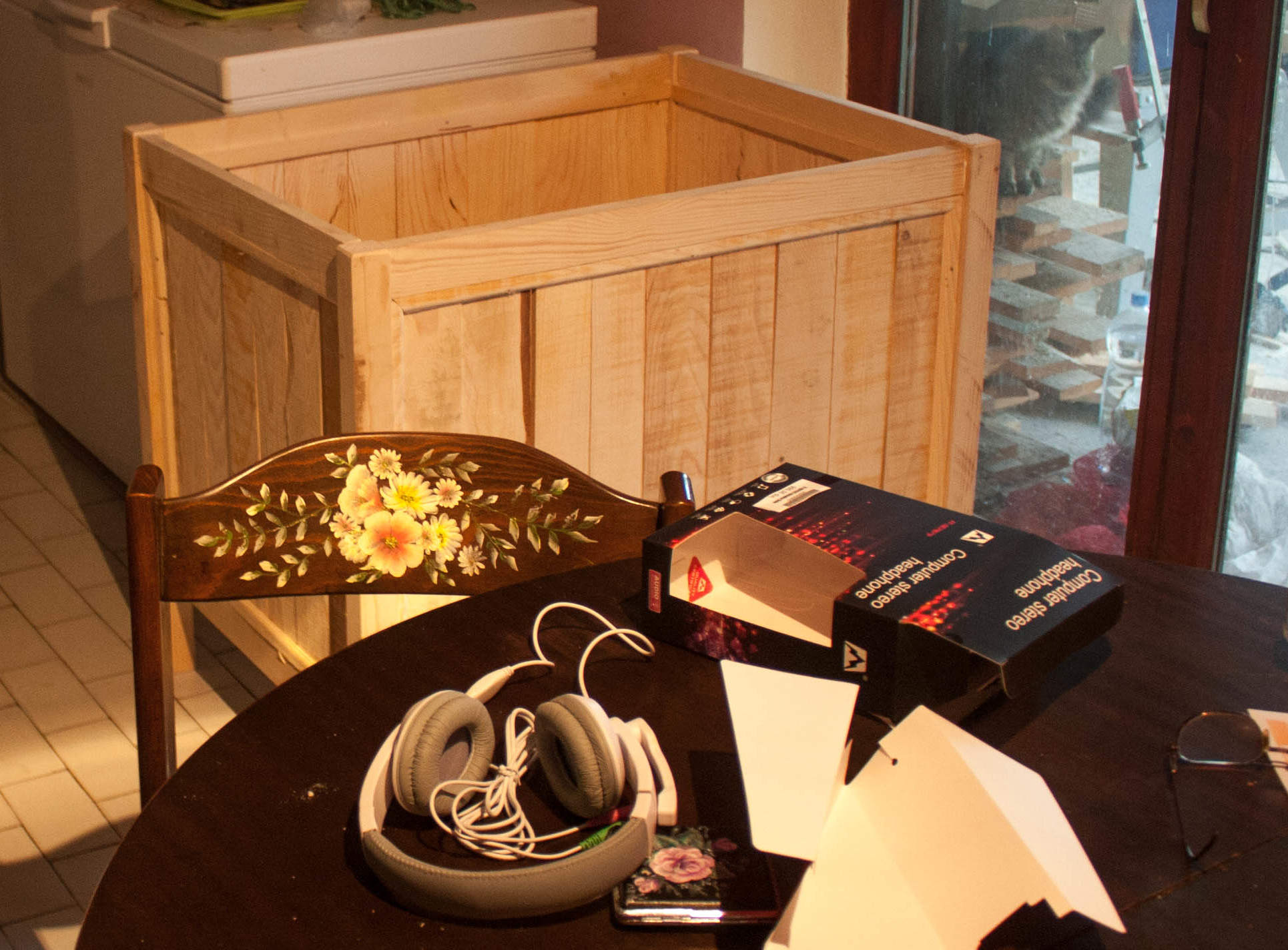 On 7th I went to buy some stuff and, along the way, bought this headset for her - it's the day of international women, so there, it's appropriate. She can plug it into her laptop and play at any desired level, without interference from my speakers. The cage is that wooden crate behind the chair.
