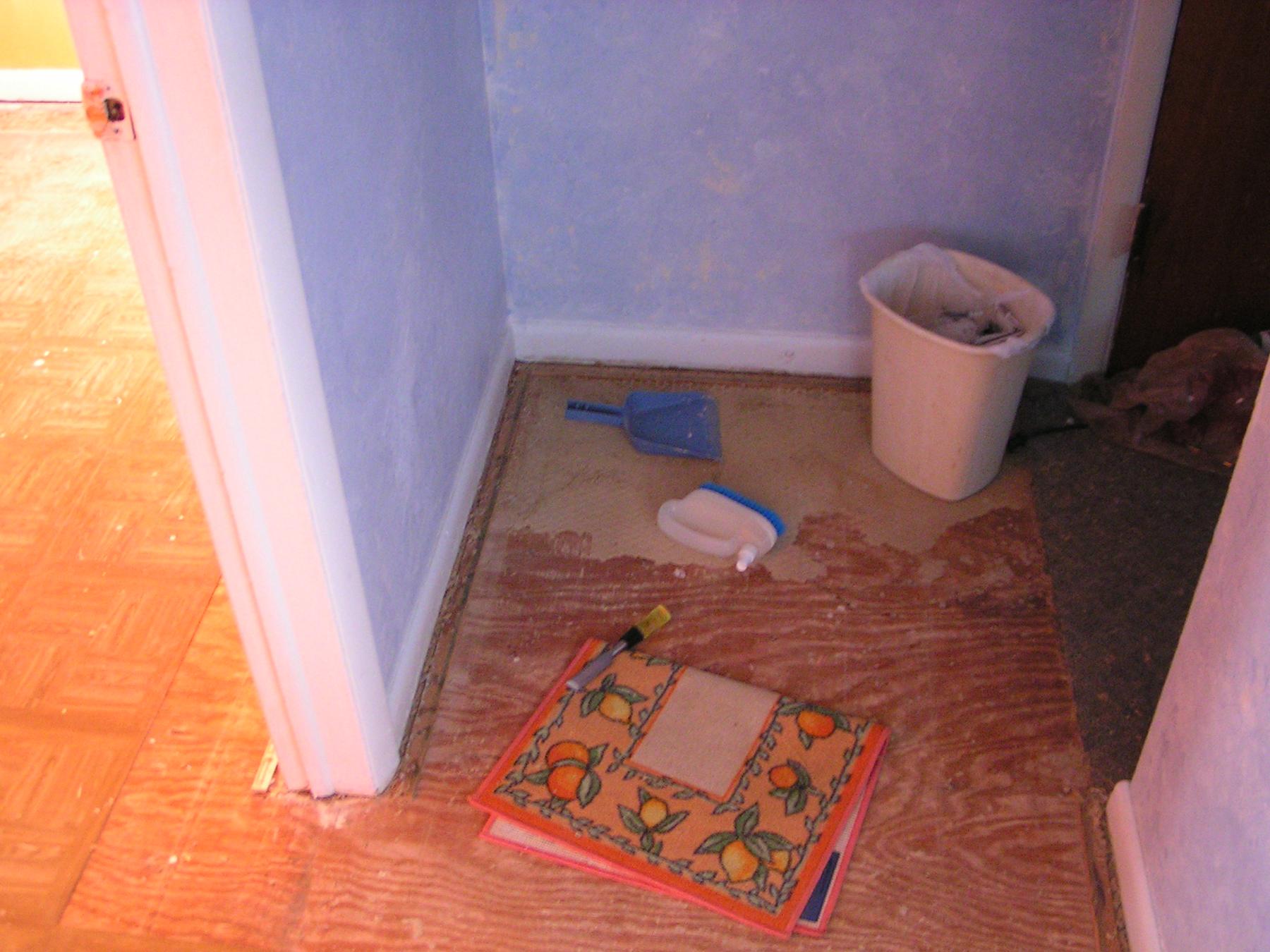 Maybe I shouldn't have, as at least ten times it occured to me that I totally fucked up myself with even beginning that job, but now that I've started, I won't give up, I'll get it done all the way. Some with vekšmajzl, some with a chisel, a brush and dustpan at hand, treshhold (yes!) carpet folded under my knees, and slow does it. Fuckit, it did go slow, and the knees hurt even with that padding. But I got it done.