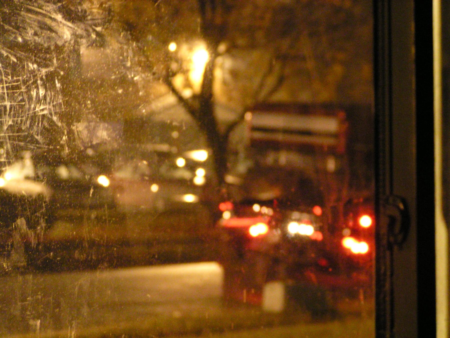 Something was burning across the street in the evening, nothing serious, firemen drew themselves on time. The Conica didn't turn out to be up to task, there's not one well focused shot... except this one, where the only thing in focus are these smudges on the glass, remaining since the time when various anouncements were pasted there while the house was on sale.