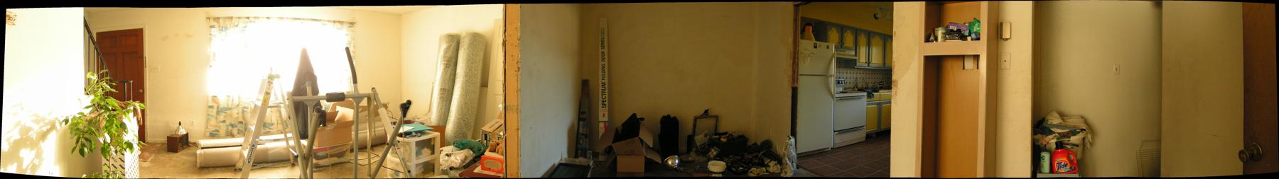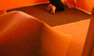 No photos for today, only video - because we were laying the carpets upstairs, in the hall and Nina's room. This shot I extracted from the video, which is only the minimal 320 pixels wide, so give what you give. So now the orange room has the carpet as well. It's the same carpet as elsewhere, it only looks this color because of the setting sun hitting the orange walls. We managed to cut the carpet so that it stretched all the way into the closet and the hall in one piece. It's quite unwieldy, stiff and hard to grasp, but we managed somehow. We had to glue it at only one place, where it connects with the piece in Lena's room. The glue is a bead on some strong tape that you put under the stitch and heat up with the ironing iron* and then step on it. We accidentally fit the pattern too, so the seam is unnoticeable.