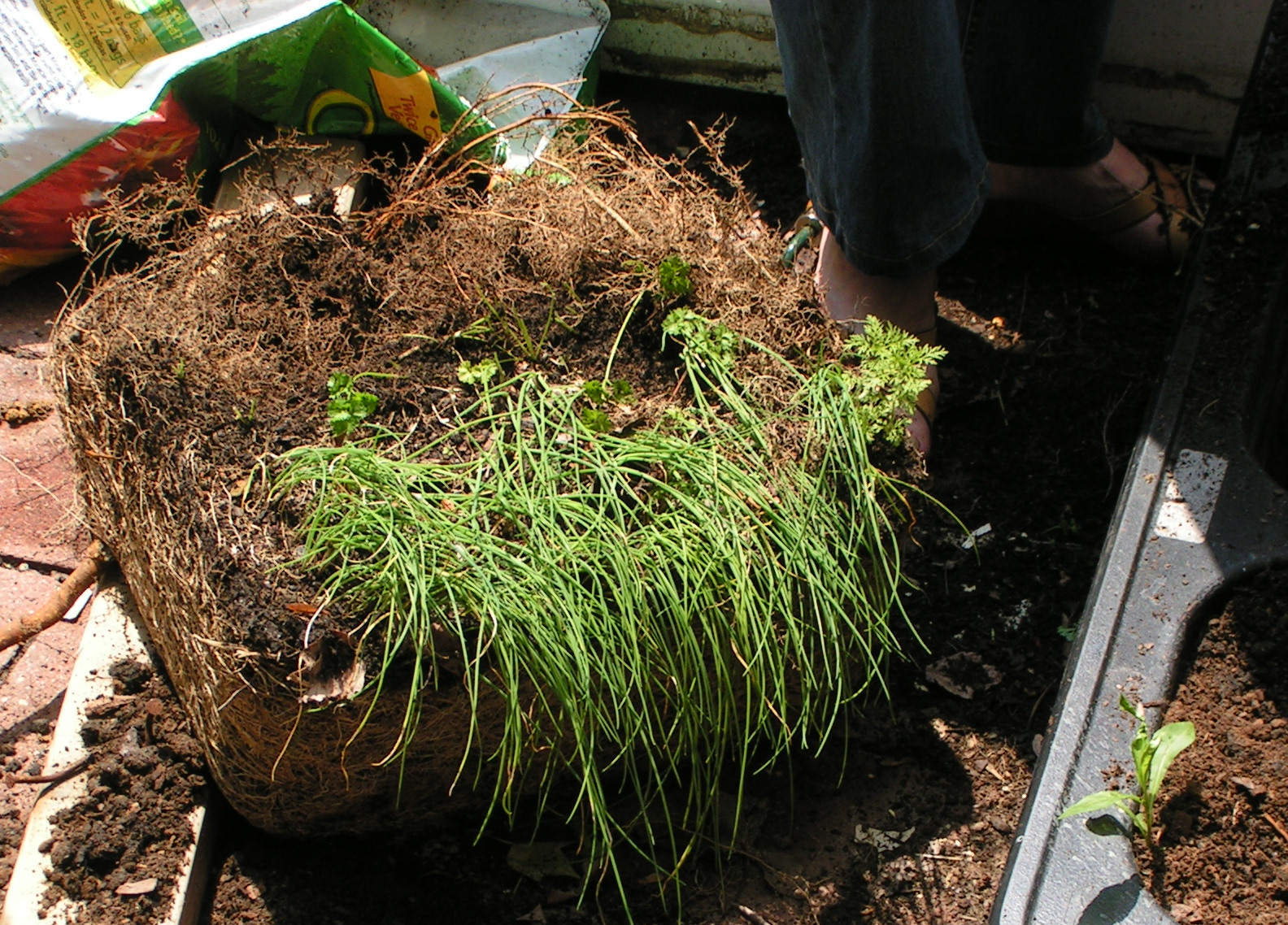 On sixth we took to check the flowerpots we made from the old sink and tub, as nothing grew as expected. Out of six plants in the sink, only the chives grew but they were also very thin and not good at all. So we took out the cube root.