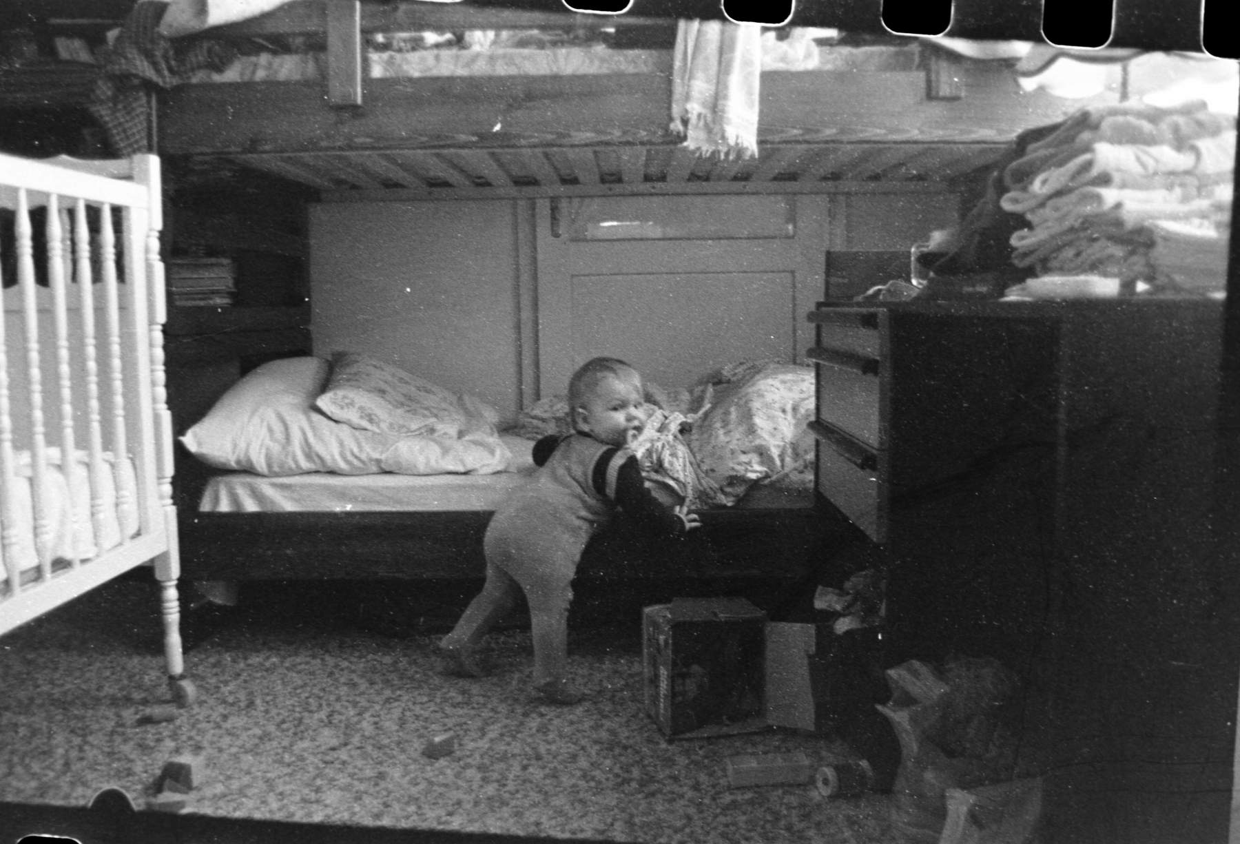 Нина је почела да пузи, проходаће за пар месеци. Под у кујни је био петнаестак сантиметара испод пода у соби, а висинску разлику је лако савладавала.