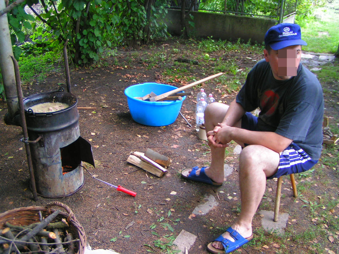 Боћа је понео свој лептоп са музиком. Онда је дошао Кунта па је почео да се крчка котлић. Кунтин рецепт иде са луком, јунетином, свињским и живинским, скоро без воде, да се свако од њих крчка по 40 минута. Зачини тек пред крај. И то је све, нема ту много мудрости - како истекне 40 минута, додајеш оно следеће. То је значило да смо наизменично седели за сточићем па око котлића, мало даље у авлији, под орахом. Ложили, пијуцкали, сликали се. Изводио сам своје уобичајене акробације прстима, Питон се зблесио. Шкрба је искористио прилику да нестане некуд са картицом из моје фоткалице, и вратио се са напрженим цедеом на ком су биле све фотке досад. Форматирао сам картицу и кренуо начисто.