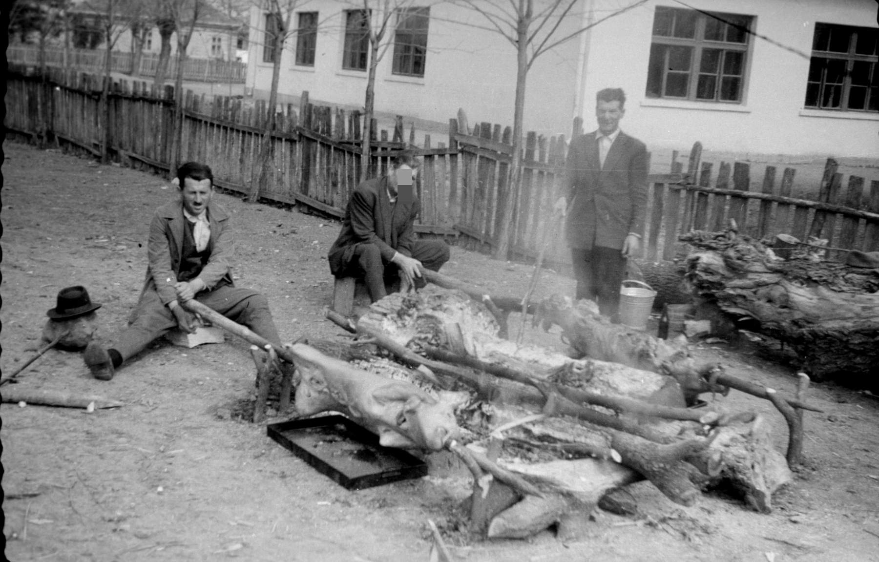 На ражњевима два поприлична крмка, али је био и један са готовим прасенцетом, то је ваљда донео кум, и на врх тога натакнута јабука.