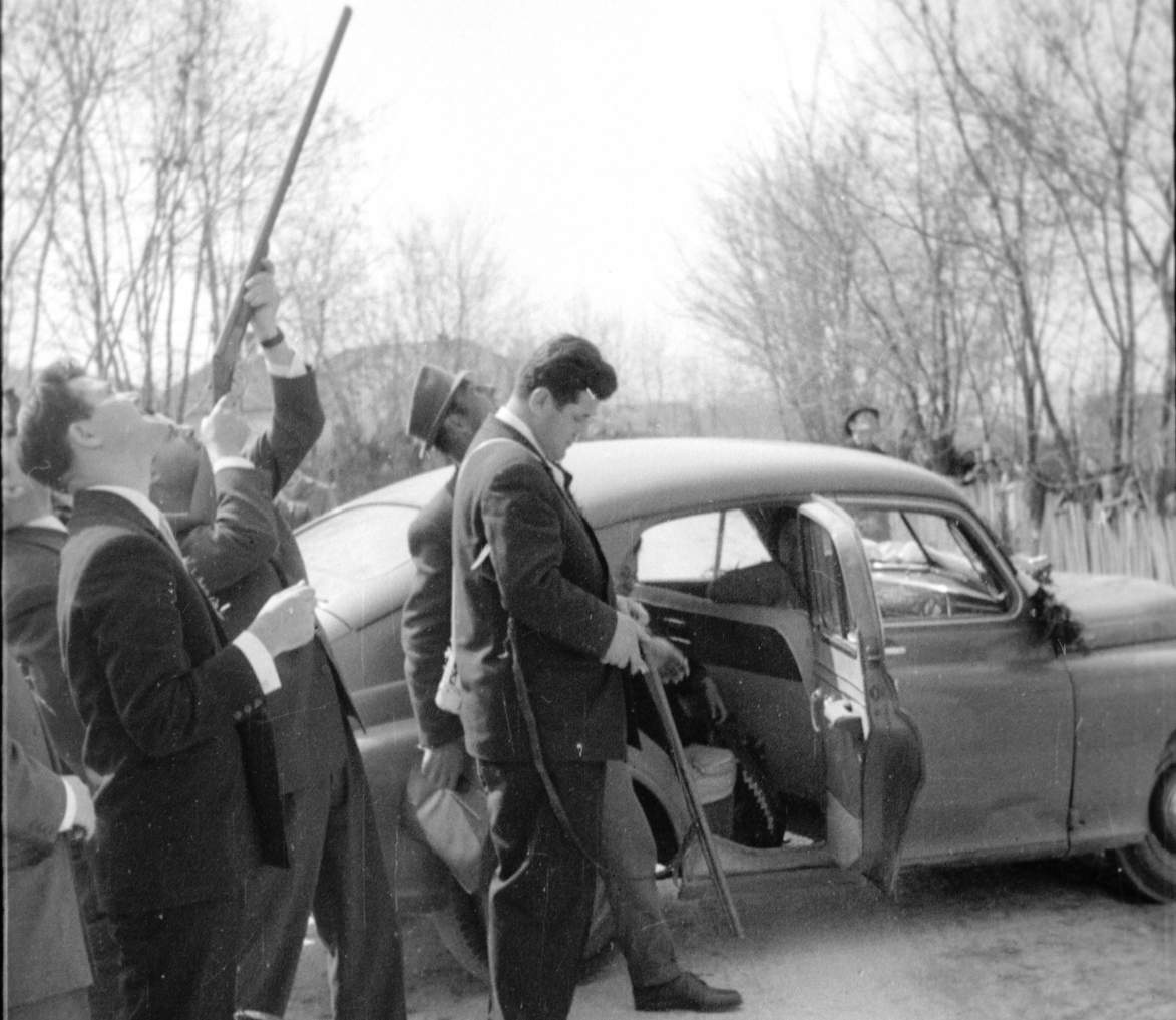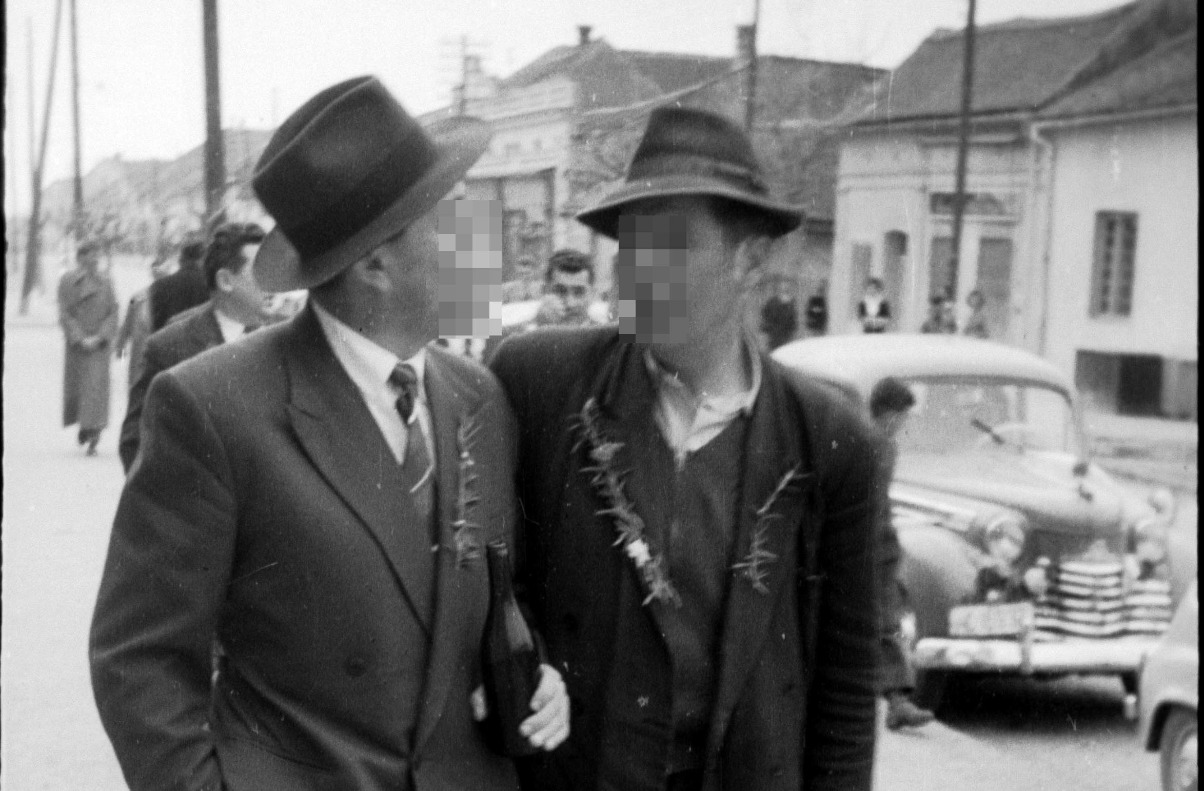 То се гађало у повратку из општине, што и није далеко. И новопечени свекар и ваљда таст (не знам човека) су се били пицнули, са најбољим својим шеширима. И, наравно, сви су носили рузмарин. Од присутних, видим да су ту комплет младожењина грана - обе сестре са мужевима, ћалетова браћа од ујака (живе прекопута), још неожењени, сви пицнути у иста одела и носе сличне брчиће, онако мангупске (већина је у оделима, са црним ципелама, ал' видим два-три домаћина у опанцима и бричес чакширама, оним што су широке изнад колена, узане испод), ту је и тетка Јања и кева јој, ал' деду не видим нигде, као ни ћалетове сестре. Да ли је то било онда кад га је ритнуо коњ и поломио му два-три ребра па је био у болници, или је опет моја прабаба нешто замутила између браће, ко ће то знати. И они које бих још могао да питам би имали неког свог интереса да ми увале своју верзију догађаја, боље да ни не питам.