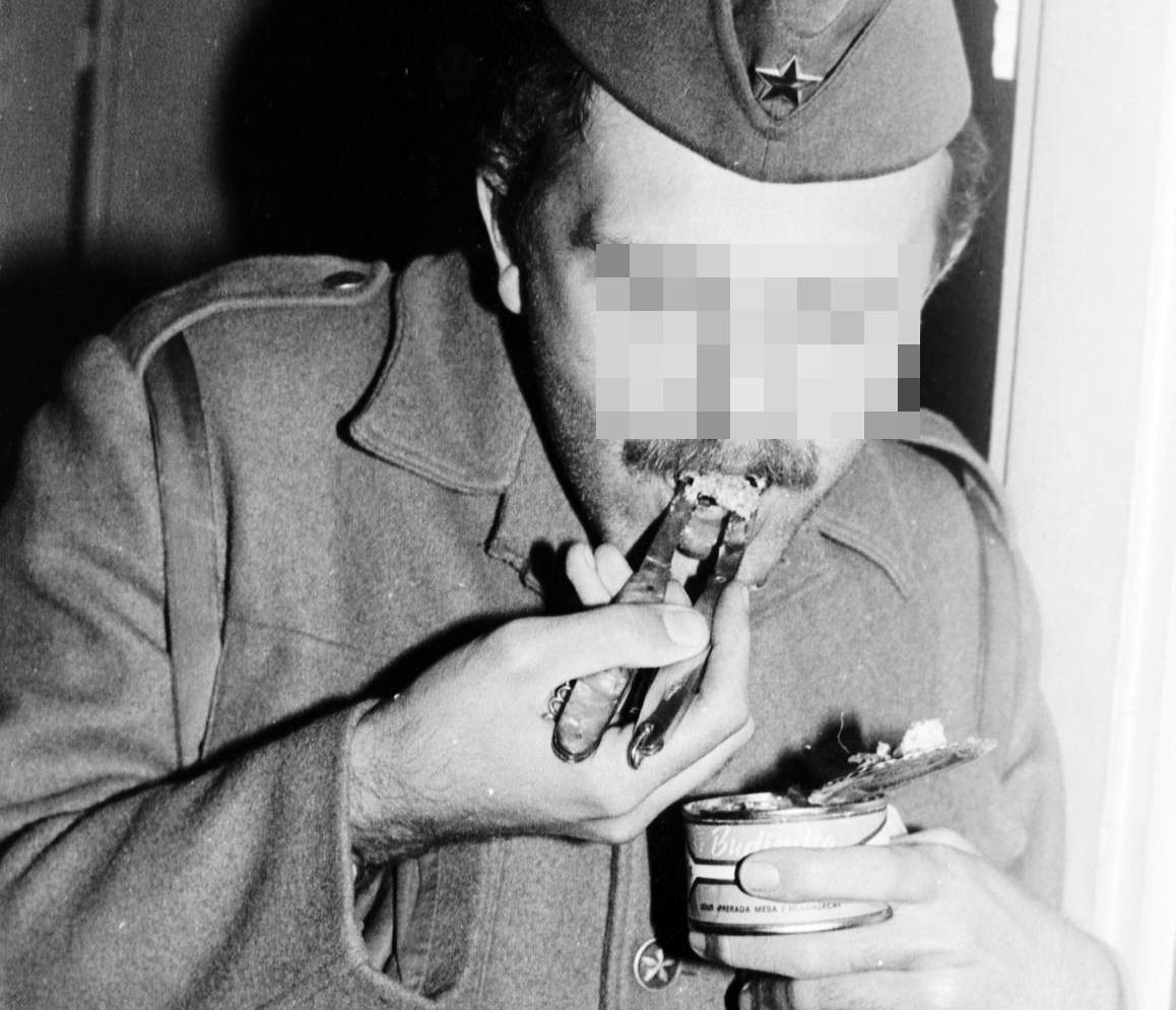 Било је и клопе, оне конзерве овчетине из истих СДО кутија, да не поверујеш колико је њих то прескакало и јело нешто из кантине кад буде тај петак у месецу кад се то једе, само је био проблем како то јести, нисмо баш мислили да привремено присвојимо нож и виљушку из мензе, а уз сву ону опрему никад нисмо добили есцајг. Чутурице јесмо, ал' у њима никад ничег није било. Но, у џепу сам увек имао брису (како се у Банату зове перорез), нашла се још једна, па сам демонстрирао како се једе штапићима... Свашта ваља умети, никад не знаш кад ће добро да дође.