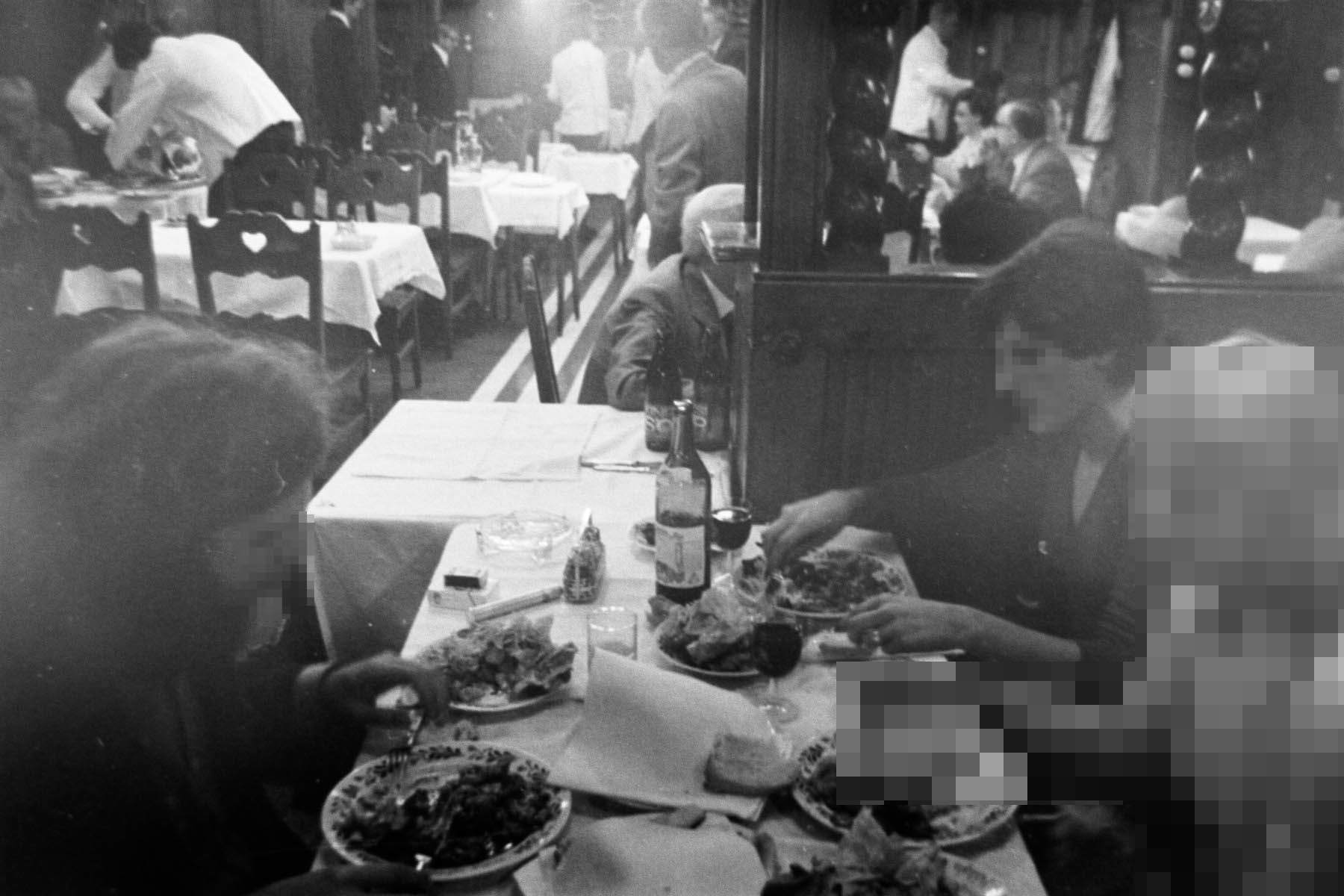 Вечерали у Матијином подруму (краља Матије), отмено музејско место. Знао сам већ из прича какви су пештански келнери и таксисти, пуни трикова да измузу што више али да им ипак опет дођеш. Пажњу смо привукли - две згодне рибе, нарочито како Ђенђи носи мало више шминке и фарба косу (рекао бих опет цвекла), носи ту узану јакницу и елегантне звонцаре. (... 15 речи...) Ја као и обично у старим фармеркама, тамној кошуљи, зеленој сомотској јакни, са косом до рамена и раздељеном брадом. Јесмо мало штрчали...