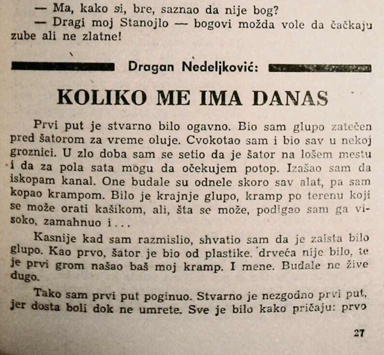 Ово баш има историју. Једина икад објављена на папиру. У јунском броју Сиријуса 1983. у склопу 14. мини Ју-Сиријуса, где су пружали прилику домаћим писцима. Превео сам је на енглески 2003. а онда негде затурио оригинал. Срећом, имам фотографије тих страница.